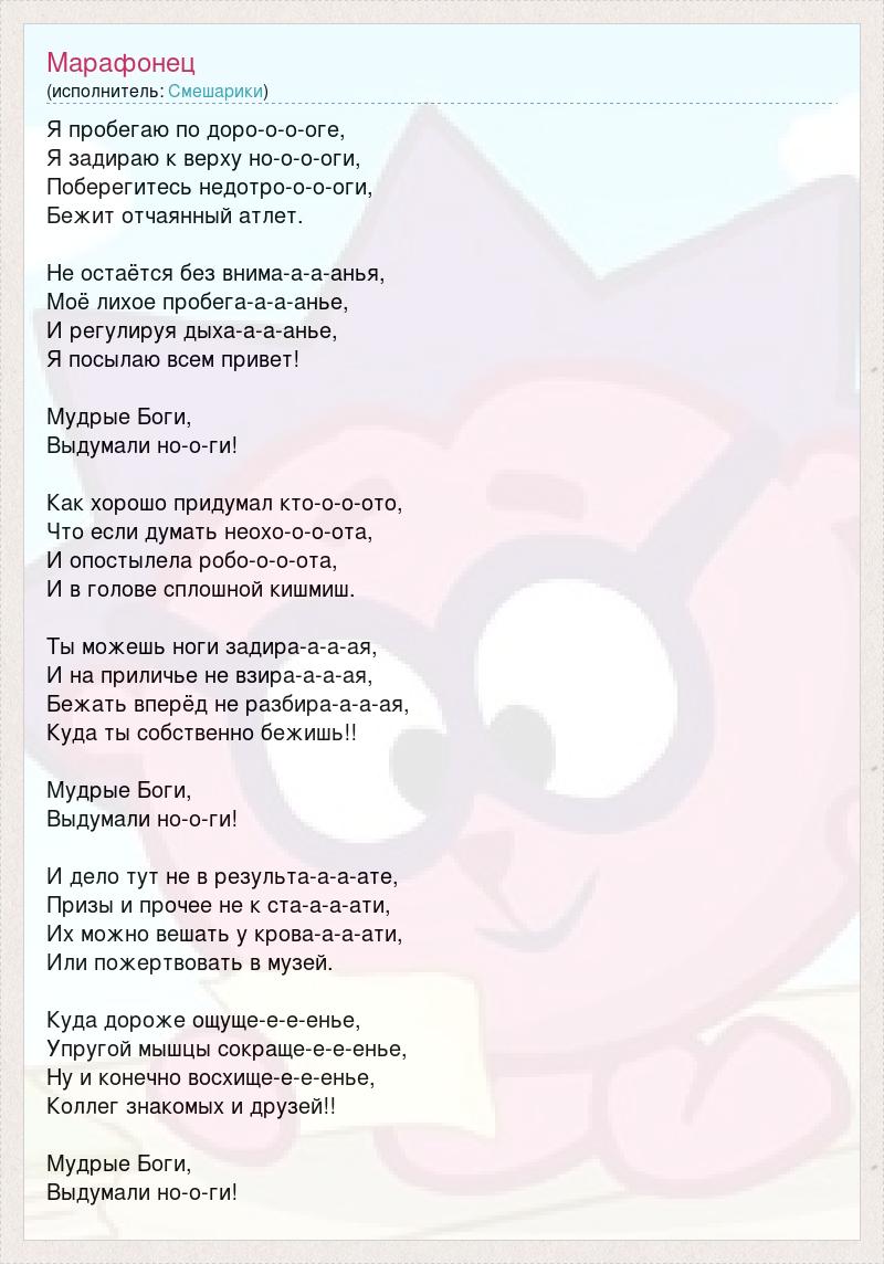 Я пробегаю по доро-о-о-оге, Я задираю к верху но-о-о-оги, Поберегитесь недотро-о-о-оги, Бежит отчаянный атлет. Не остаётся без внима-а-а-анья, Моё лихое пробега-а-а-анье, И регулируя дыха-а-а-анье, Я посылаю всем привет! Мудрые Боги, Выдумали но-о-ги! Как хорошо придумал кто-о-о-ото, Что если думать неохо-о-о-ота, И опостылела робо-о-о-ота, И в голове сплошной кишмиш. Ты можешь ноги задира-а-а-ая, И на приличье не взира-а-а-ая, Бежать вперёд не разбира-а-а-ая, Куда ты собственно бежишь!! Мудрые Боги, Выдумали но-о-ги! И дело тут не в результа-а-а-ате, Призы и прочее не к ста-а-а-ати, Их можно вешать у крова-а-а-ати, Или пожертвовать в музей. Куда дороже ощуще-е-е-енье, Упругой мышцы сокраще-е-е-енье, Ну и конечно восхище-е-е-енье, Коллег знакомых и друзей!! Мудрые Боги, Выдумали но-о-ги!