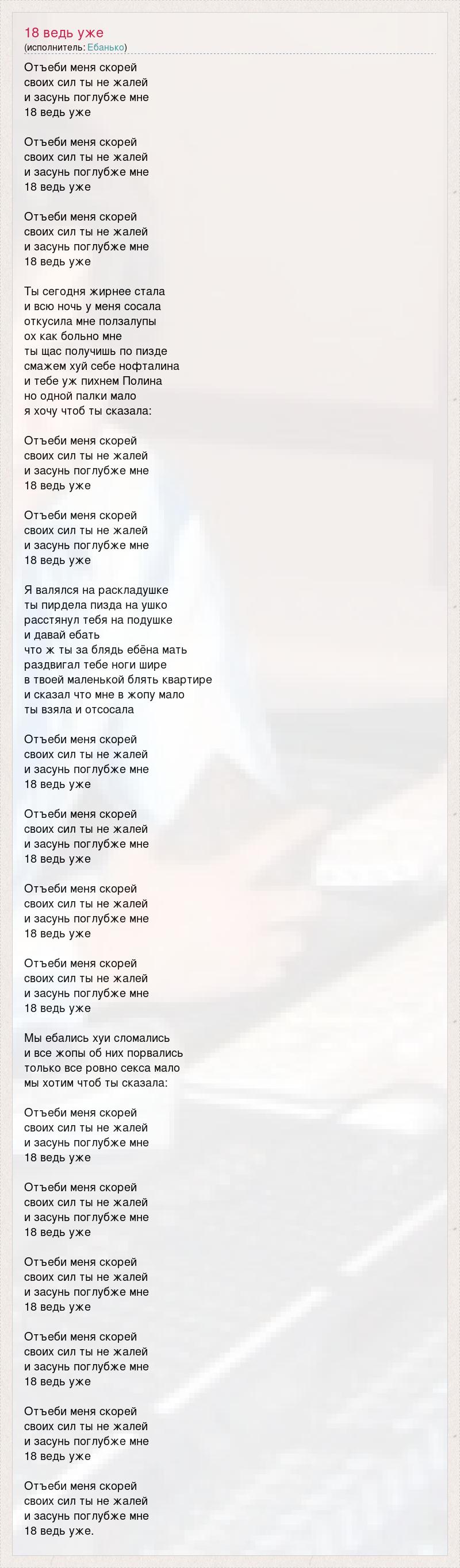 Отъеби меня скорей своих сил ты не жалей и засунь поглубже мне 18 ведь уже Отъеби меня скорей своих сил ты не жалей и засунь поглубже мне 18 ведь уже Отъеби меня скорей своих сил ты не жалей и засунь поглубже мне 18 ведь уже Ты сегодня жирнее стала и всю ночь у меня сосала откусила мне ползалупы ох как больно мне ты щас получишь по пизде смажем хуй себе нофталина и тебе уж пихнем Полина но одной палки мало я хочу чтоб ты сказала: Отъеби меня скорей своих сил ты не жалей и засунь поглубже мне 18 ведь уже Отъеби меня скорей своих сил ты не жалей и засунь поглубже мне 18 ведь уже Я валялся на раскладушке ты пирдела пизда на ушко расстянул тебя на подушке и давай ебать что ж ты за блядь ебёна мать раздвигал тебе ноги шире в твоей маленькой блять квартире и сказал что мне в жопу мало ты взяла и отсосала Отъеби меня скорей своих сил ты не жалей и засунь поглубже мне 18 ведь уже Отъеби меня скорей своих сил ты не жалей и засунь поглубже мне 18 ведь уже Отъеби меня скорей своих сил ты не жалей и засунь поглубже мне 18 ведь уже Отъеби меня скорей своих сил ты не жалей и засунь поглубже мне 18 ведь уже Мы ебались хуи сломались и все жопы об них порвались только все ровно секса мало мы хотим чтоб ты сказала: Отъеби меня скорей своих сил ты не жалей и засунь поглубже мне 18 ведь уже Отъеби меня скорей своих сил ты не жалей и засунь поглубже мне 18 ведь уже Отъеби меня скорей своих сил ты не жалей и засунь поглубже мне 18 ведь уже Отъеби меня скорей своих сил ты не жалей и засунь поглубже мне 18 ведь уже Отъеби меня скорей своих сил ты не жалей и засунь поглубже мне 18 ведь уже Отъеби меня скорей своих сил ты не жалей и засунь поглубже мне 18 ведь уже.