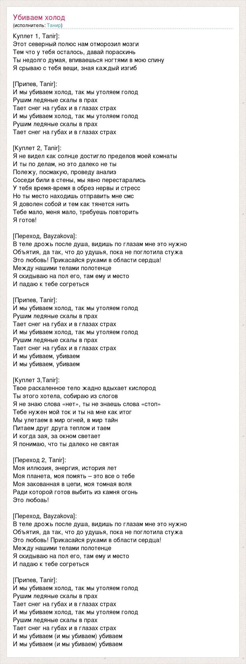 Куплет 1, Tanir]: Этот северный полюс нам отморозил мозги Тем что у тебя осталось, давай пораскинь Ты недолго думая, впиваешься ногтями в мою спину Я срываю с тебя вещи, зная каждый изгиб [Припев, Tanir]: И мы убиваем холод, так мы утоляем голод Рушим ледяные скалы в прах Тает снег на губах и в глазах страх И мы убиваем холод, так мы утоляем голод Рушим ледяные скалы в прах Тает снег на губах и в глазах страх [Куплет 2, Tanir]: Я не видел как солнце достигло пределов моей комнаты И ты по делам, но это далеко не ты Полежу, посмакую, проведу анализ Соседи били в стены, мы явно перестарались У тебя время-время в обрез нервы и стресс Но ты место находишь отправить мне смс Я доволен собой и тем как тянется нить Тебе мало, меня мало, требуешь повторить Я готов! [Переход, Bayzakova]: В теле дрожь после душа, видишь по глазам мне это нужно Объятия, да так, что до удушья, пока не поглотила стужа Это любовь! Прикасайся руками в области сердца! Между нашими телами полотенце Я скидываю на пол его, там ему и место И падаю к тебе согреться [Припев, Tanir]: И мы убиваем холод, так мы утоляем голод Рушим ледяные скалы в прах Тает снег на губах и в глазах страх И мы убиваем холод, так мы утоляем голод Рушим ледяные скалы в прах Тает снег на губах и в глазах страх И мы убиваем, убиваем И мы убиваем, убиваем [Куплет 3,Tanir]: Твое раскаленное тело жадно вдыхает кислород Ты этого хотела, собираю из слогов Я не знаю слова «нет», ты не знаешь слова «стоп» Тебе нужен мой ток и ты на мне как итог Мы улетаем в мир огней, в мир тайн Питаем друг друга теплом и таем И когда зая, за окном светает Я понимаю, что ты далеко не святая [Переход 2, Tanir]: Моя иллюзия, энергия, история лет Моя планета, моя помять – это все о тебе Моя закованная в цепи, моя томная воля Ради которой готов выбить из камня огонь Это любоаь! [Переход, Bayzakova]: В теле дрожь после душа, видишь по глазам мне это нужно Объятия, да так, что до удушья, пока не поглотила стужа Это любовь! Прикасайся руками в области сердца! Между нашими телами полотенце Я скидываю на пол его, там ему и место И падаю к тебе согреться [Припев, Tanir]: И мы убиваем холод, так мы утоляем голод Рушим ледяные скалы в прах Тает снег на губах и в глазах страх И мы убиваем холод, так мы утоляем голод Рушим ледяные скалы в прах Тает снег на губах и в глазах страх И мы убиваем (и мы убиваем) убиваем И мы убиваем (и мы убиваем) убиваем