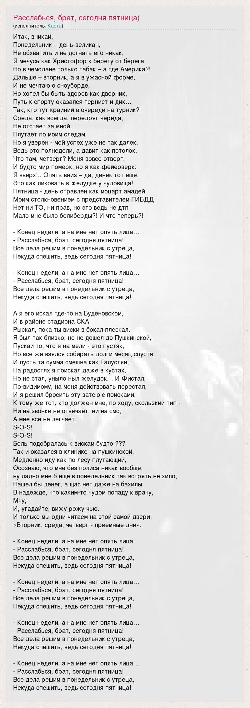 Итак, вникай, Понедельник – день-великан, Не обхватить и не догнать его никак, Я мечусь как Христофор к берегу от берега, Но в чемодане только табак – а где Америка?! Дальше – вторник, а я в ужасной форме, И не мечтаю о сноуборде, Но хотел бы быть здоров как дворник, Путь к спорту оказался тернист и дик… Так, кто тут крайний в очереди на турник? Среда, как всегда, передряг череда, Не отстает за мной, Плутает по моим следам, Но я уверен - мой успех уже не так далек, Ведь это полнедели, а давит как потолок, Что там, четверг? Меня вовсе отверг, И будто мир померк, но я как фейерверк: Я вверх!.. Опять вниз – да, денек тот еще, Это как ликовать в желудке у чудовища! Пятница - день отравлен как моцарт амадей Моим столкновением с представителем ГИБДД Нет ни ТО, ни прав, но это ведь не дтп Мало мне было белиберды?! И что теперь?! - Конец недели, а на мне нет опять лица… - Расслабься, брат, сегодня пятница! Все дела решим в понедельник с утреца, Некуда спешить, ведь сегодня пятница! - Конец недели, а на мне нет опять лица… - Расслабься, брат, сегодня пятница! Все дела решим в понедельник с утреца, Некуда спешить, ведь сегодня пятница! А я его искал где-то на Буденовском, И в районе стадиона СКА Рыскал, пока ты виски в бокал плескал. Я был так близко, но не дошел до Пушкинской, Пускай то, что я на мели - это пустяк, Но все же взялся собирать долги месяц спустя, И пусть та сумма смешна как Галустян, На радостях я поискал даже в кустах, Но не стал, уныло ныл желудок… И Фистал, По-видимому, на меня действовать перестал, И я решил бросить эту затею с поисками, К тому же тот, кто должен мне, по ходу, скользкий тип - Ни на звонки не отвечает, ни на смс, А мне все не легчает, S-O-S! S-O-S! Боль подобралась к вискам будто ??? Так и оказался в клинике на пушкинской, Медленно иду как по лесу плутающий, Осознаю, что мне без полиса никак вообще, ну ладно мне б еще в понедельник так встрять не хило, Нашел бы денег, а щас нет даже на бахилы. В надежде, что каким-то чудом попаду к врачу, Мчу, И, угадайте, вижу рожу чью. И только мы одни читаем на этой самой двери: «Вторник, среда, четверг - приемные дни». - Конец недели, а на мне нет опять лица… - Расслабься, брат, сегодня пятница! Все дела решим в понедельник с утреца, Некуда спешить, ведь сегодня пятница! - Конец недели, а на мне нет опять лица… - Расслабься, брат, сегодня пятница! Все дела решим в понедельник с утреца, Некуда спешить, ведь сегодня пятница! - Конец недели, а на мне нет опять лица… - Расслабься, брат, сегодня пятница! Все дела решим в понедельник с утреца, Некуда спешить, ведь сегодня пятница! - Конец недели, а на мне нет опять лица… - Расслабься, брат, сегодня пятница! Все дела решим в понедельник с утреца, Некуда спешить, ведь сегодня пятница!