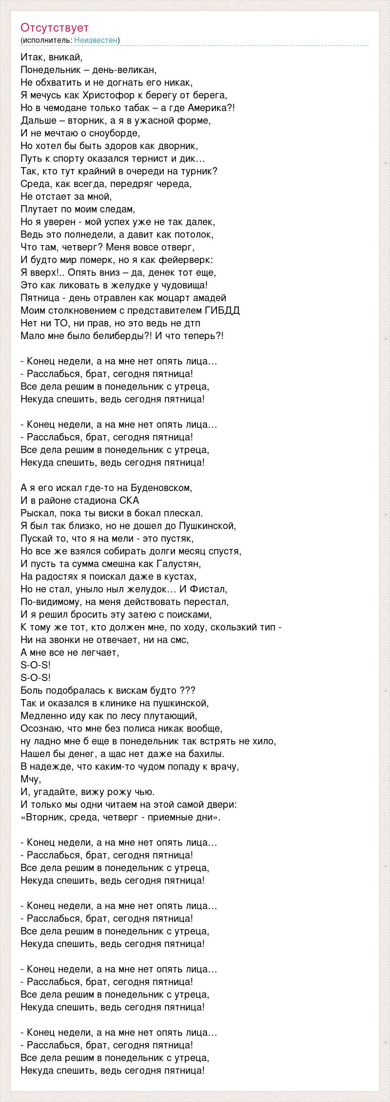 Итак, вникай, Понедельник – день-великан, Не обхватить и не догнать его никак, Я мечусь как Христофор к берегу от берега, Но в чемодане только табак – а где Америка?! Дальше – вторник, а я в ужасной форме, И не мечтаю о сноуборде, Но хотел бы быть здоров как дворник, Путь к спорту оказался тернист и дик… Так, кто тут крайний в очереди на турник? Среда, как всегда, передряг череда, Не отстает за мной, Плутает по моим следам, Но я уверен - мой успех уже не так далек, Ведь это полнедели, а давит как потолок, Что там, четверг? Меня вовсе отверг, И будто мир померк, но я как фейерверк: Я вверх!.. Опять вниз – да, денек тот еще, Это как ликовать в желудке у чудовища! Пятница - день отравлен как моцарт амадей Моим столкновением с представителем ГИБДД Нет ни ТО, ни прав, но это ведь не дтп Мало мне было белиберды?! И что теперь?! - Конец недели, а на мне нет опять лица… - Расслабься, брат, сегодня пятница! Все дела решим в понедельник с утреца, Некуда спешить, ведь сегодня пятница! - Конец недели, а на мне нет опять лица… - Расслабься, брат, сегодня пятница! Все дела решим в понедельник с утреца, Некуда спешить, ведь сегодня пятница! А я его искал где-то на Буденовском, И в районе стадиона СКА Рыскал, пока ты виски в бокал плескал. Я был так близко, но не дошел до Пушкинской, Пускай то, что я на мели - это пустяк, Но все же взялся собирать долги месяц спустя, И пусть та сумма смешна как Галустян, На радостях я поискал даже в кустах, Но не стал, уныло ныл желудок… И Фистал, По-видимому, на меня действовать перестал, И я решил бросить эту затею с поисками, К тому же тот, кто должен мне, по ходу, скользкий тип - Ни на звонки не отвечает, ни на смс, А мне все не легчает, S-O-S! S-O-S! Боль подобралась к вискам будто ??? Так и оказался в клинике на пушкинской, Медленно иду как по лесу плутающий, Осознаю, что мне без полиса никак вообще, ну ладно мне б еще в понедельник так встрять не хило, Нашел бы денег, а щас нет даже на бахилы. В надежде, что каким-то чудом попаду к врачу, Мчу, И, угадайте, вижу рожу чью. И только мы одни читаем на этой самой двери: «Вторник, среда, четверг - приемные дни». - Конец недели, а на мне нет опять лица… - Расслабься, брат, сегодня пятница! Все дела решим в понедельник с утреца, Некуда спешить, ведь сегодня пятница! - Конец недели, а на мне нет опять лица… - Расслабься, брат, сегодня пятница! Все дела решим в понедельник с утреца, Некуда спешить, ведь сегодня пятница! - Конец недели, а на мне нет опять лица… - Расслабься, брат, сегодня пятница! Все дела решим в понедельник с утреца, Некуда спешить, ведь сегодня пятница! - Конец недели, а на мне нет опять лица… - Расслабься, брат, сегодня пятница! Все дела решим в понедельник с утреца, Некуда спешить, ведь сегодня пятница!