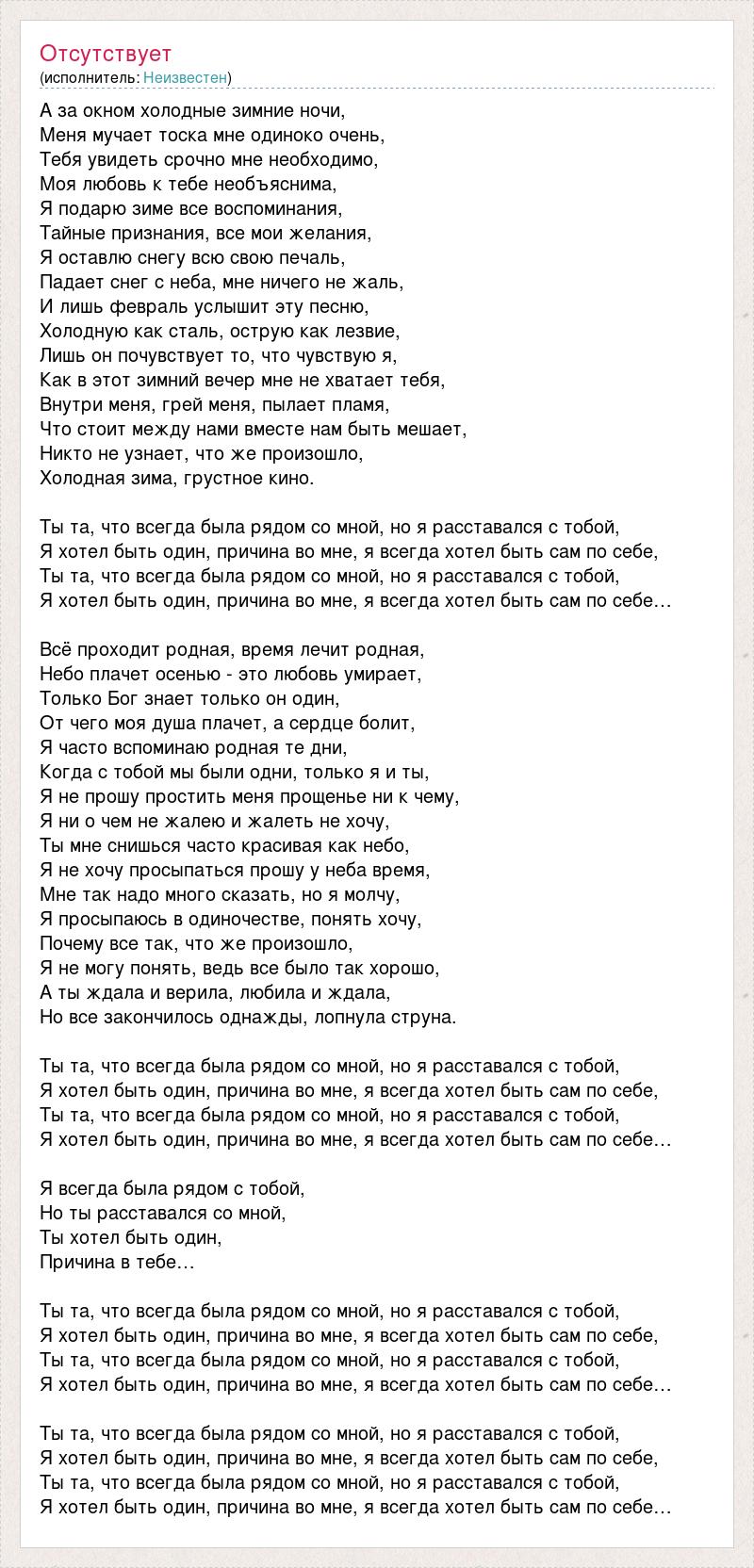 А за окном холодные зимние ночи, Меня мучает тоска мне одиноко очень, Тебя увидеть срочно мне необходимо, Моя любовь к тебе необъяснима, Я подарю зиме все воспоминания, Тайные признания, все мои желания, Я оставлю снегу всю свою печаль, Падает снег с неба, мне ничего не жаль, И лишь февраль услышит эту песню, Холодную как сталь, острую как лезвие, Лишь он почувствует то, что чувствую я, Как в этот зимний вечер мне не хватает тебя, Внутри меня, грей меня, пылает пламя, Что стоит между нами вместе нам быть мешает, Никто не узнает, что же произошло, Холодная зима, грустное кино. Ты та, что всегда была рядом со мной, но я расставался с тобой, Я хотел быть один, причина во мне, я всегда хотел быть сам по себе, Ты та, что всегда была рядом со мной, но я расставался с тобой, Я хотел быть один, причина во мне, я всегда хотел быть сам по себе… Всё проходит родная, время лечит родная, Небо плачет осенью - это любовь умирает, Только Бог знает только он один, От чего моя душа плачет, а сердце болит, Я часто вспоминаю родная те дни, Когда с тобой мы были одни, только я и ты, Я не прошу простить меня прощенье ни к чему, Я ни о чем не жалею и жалеть не хочу, Ты мне снишься часто красивая как небо, Я не хочу просыпаться прошу у неба время, Мне так надо много сказать, но я молчу, Я просыпаюсь в одиночестве, понять хочу, Почему все так, что же произошло, Я не могу понять, ведь все было так хорошо, А ты ждала и верила, любила и ждала, Но все закончилось однажды, лопнула струна. Ты та, что всегда была рядом со мной, но я расставался с тобой, Я хотел быть один, причина во мне, я всегда хотел быть сам по себе, Ты та, что всегда была рядом со мной, но я расставался с тобой, Я хотел быть один, причина во мне, я всегда хотел быть сам по себе… Я всегда была рядом с тобой, Но ты расставался со мной, Ты хотел быть один, Причина в тебе… Ты та, что всегда была рядом со мной, но я расставался с тобой, Я хотел быть один, причина во мне, я всегда хотел быть сам по себе, Ты та, что всегда была рядом со мной, но я расставался с тобой, Я хотел быть один, причина во мне, я всегда хотел быть сам по себе… Ты та, что всегда была рядом со мной, но я расставался с тобой, Я хотел быть один, причина во мне, я всегда хотел быть сам по себе, Ты та, что всегда была рядом со мной, но я расставался с тобой, Я хотел быть один, причина во мне, я всегда хотел быть сам по себе…