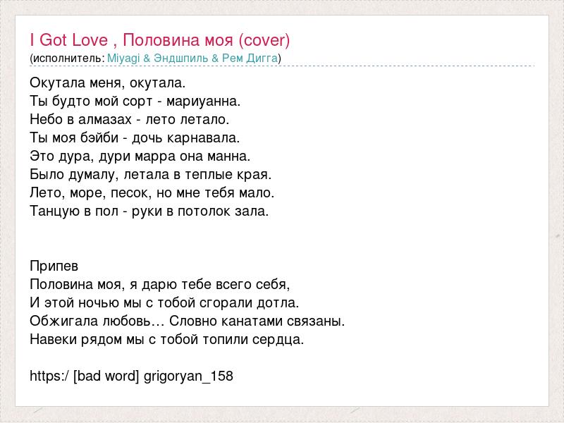 Окутала меня, окутала. Ты будто мой сорт - мариуанна. Небо в алмазах - лето летало. Ты моя бэйби - дочь карнавала. Это дура, дури марра она манна. Было думалу, летала в теплые края. Лето, море, песок, но мне тебя мало. Танцую в пол - руки в потолок зала. Припев Половина моя, я дарю тебе всего себя, И этой ночью мы с тобой сгорали дотла. Обжигала любовь… Словно канатами связаны. Навеки рядом мы с тобой топили сердца. https:/ [bad word] grigoryan_158