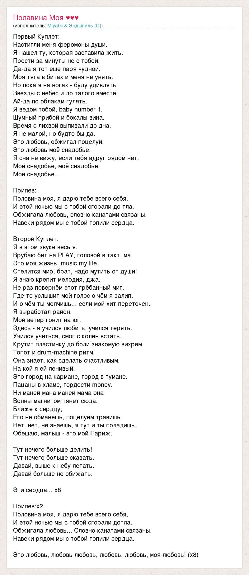 Первый Куплет: Настигли меня феромоны души. Я нашел ту, которая заставила жить. Прости за минуты не с тобой. Да-да я тот еще паря чудной. Моя тяга в битах и меня не унять. Но пока я на ногах - буду удивлять. Звёзды с небес и до талого вместе. Ай-да по облакам гулять. Я ведом тобой, baby number 1. Шумный прибой и бокалы вина. Время с лихвой выпивали до дна. Я не малой, но будто бы да. Это любовь, обжигал поцелуй. Это любовь моё снадобье. Я сна не вижу, если тебя вдруг рядом нет. Моё снадобье, моё снадобье. Моё снадобье... Припев: Половина моя, я дарю тебе всего себя. И этой ночью мы с тобой сгорали до тла. Обжигала любовь, словно канатами связаны. Навеки рядом мы с тобой топили сердца. Второй Куплет: Я в этом звуке весь я. Врубаю бит на PLAY, головой в такт, ма. Это моя жизнь, music my life. Стелится мир, брат, надо мутить от души! Я знаю крепит мелодия, джа. Не раз повернём этот грёбанный миг. Где-то услышит мой голос о чём я залип. И о чём ты молчишь... если мой хит переточен. Я выработал район. Мой ветер гонит на юг. Здесь - я учился любить, учился терять. Учился учиться, смог с колен встать. Крутит пластинку до боли знакомую вихрем. Топот и drum-machine ритм. Она знает, как сделать счастливым. На кой я ей ленивый. Это город на кармане, город в тумане. Пацаны в хламе, гордости money. Ни маней мана маней мама она Волны магнитом тянет сюда. Ближе к сердцу; Его не обманешь, поцелуем травишь. Нет, нет, не знаешь, я тут и ты поладишь. Обещаю, малыш - это мой Париж. Тут нечего больше делить! Тут нечего больше сказать. Давай, выше к небу летать. Давай больше не обижать. Эти сердца... x8 Припев:x2 Половина моя, я дарю тебе всего себя, И этой ночью мы с тобой сгорали дотла. Обжигала любовь... Словно канатами связаны. Навеки рядом мы с тобой топили сердца. Это любовь, любовь любовь, любовь, любовь, моя любовь! (х8)