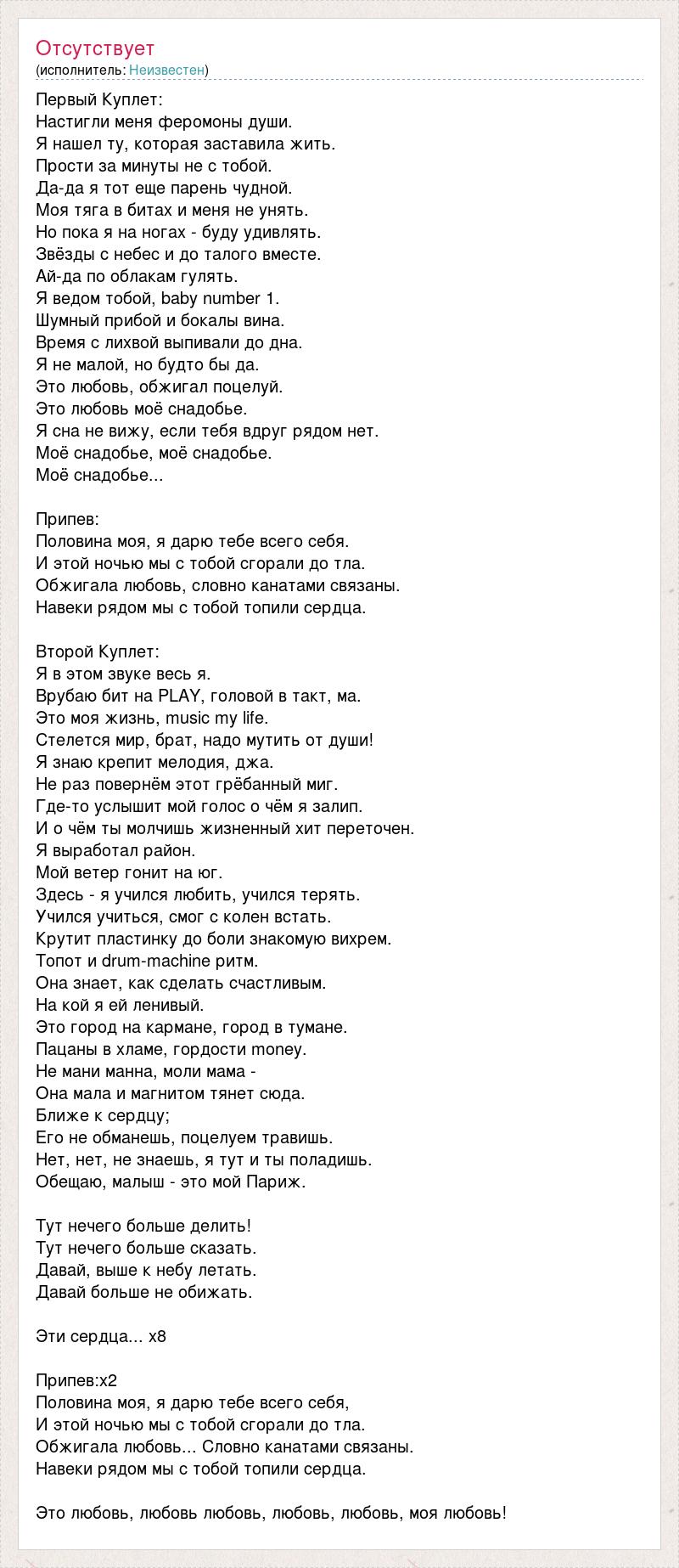 Первый Куплет: Настигли меня феромоны души. Я нашел ту, которая заставила жить. Прости за минуты не с тобой. Да-да я тот еще парень чудной. Моя тяга в битах и меня не унять. Но пока я на ногах - буду удивлять. Звёзды с небес и до талого вместе. Ай-да по облакам гулять. Я ведом тобой, baby number 1. Шумный прибой и бокалы вина. Время с лихвой выпивали до дна. Я не малой, но будто бы да. Это любовь, обжигал поцелуй. Это любовь моё снадобье. Я сна не вижу, если тебя вдруг рядом нет. Моё снадобье, моё снадобье. Моё снадобье... Припев: Половина моя, я дарю тебе всего себя. И этой ночью мы с тобой сгорали до тла. Обжигала любовь, словно канатами связаны. Навеки рядом мы с тобой топили сердца. Второй Куплет: Я в этом звуке весь я. Врубаю бит на PLAY, головой в такт, ма. Это моя жизнь, music my life. Стелется мир, брат, надо мутить от души! Я знаю крепит мелодия, джа. Не раз повернём этот грёбанный миг. Где-то услышит мой голос о чём я залип. И о чём ты молчишь жизненный хит переточен. Я выработал район. Мой ветер гонит на юг. Здесь - я учился любить, учился терять. Учился учиться, смог с колен встать. Крутит пластинку до боли знакомую вихрем. Топот и drum-machine ритм. Она знает, как сделать счастливым. На кой я ей ленивый. Это город на кармане, город в тумане. Пацаны в хламе, гордости money. Не мани манна, моли мама - Она мала и магнитом тянет сюда. Ближе к сердцу; Его не обманешь, поцелуем травишь. Нет, нет, не знаешь, я тут и ты поладишь. Обещаю, малыш - это мой Париж. Тут нечего больше делить! Тут нечего больше сказать. Давай, выше к небу летать. Давай больше не обижать. Эти сердца... x8 Припев:x2 Половина моя, я дарю тебе всего себя, И этой ночью мы с тобой сгорали до тла. Обжигала любовь... Словно канатами связаны. Навеки рядом мы с тобой топили сердца. Это любовь, любовь любовь, любовь, любовь, моя любовь!
