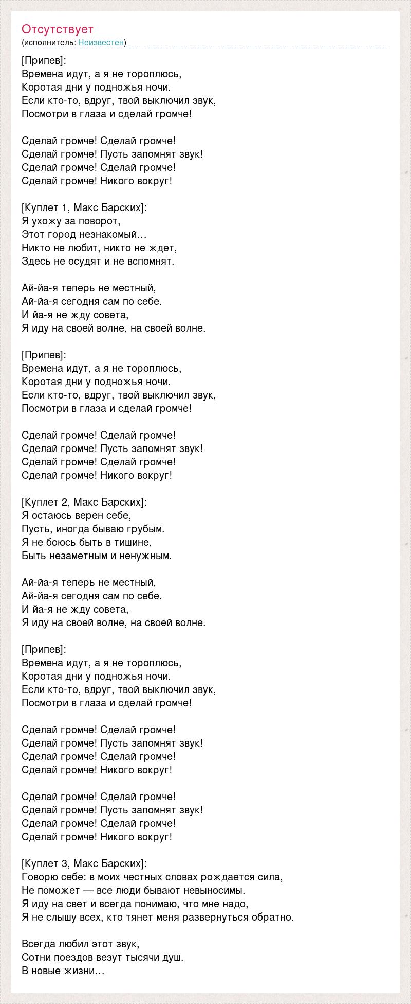 [Припев]: Времена идут, а я не тороплюсь, Коротая дни у подножья ночи. Если кто-то, вдруг, твой выключил звук, Посмотри в глаза и сделай громче! Сделай громче! Сделай громче! Сделай громче! Пусть запомнят звук! Сделай громче! Сделай громче! Сделай громче! Никого вокруг! [Куплет 1, Макс Барских]: Я ухожу за поворот, Этот город незнакомый… Никто не любит, никто не ждет, Здесь не осудят и не вспомнят. Ай-йа-я теперь не местный, Ай-йа-я сегодня сам по себе. И йа-я не жду совета, Я иду на своей волне, на своей волне. [Припев]: Времена идут, а я не тороплюсь, Коротая дни у подножья ночи. Если кто-то, вдруг, твой выключил звук, Посмотри в глаза и сделай громче! Сделай громче! Сделай громче! Сделай громче! Пусть запомнят звук! Сделай громче! Сделай громче! Сделай громче! Никого вокруг! [Куплет 2, Макс Барских]: Я остаюсь верен себе, Пусть, иногда бываю грубым. Я не боюсь быть в тишине, Быть незаметным и ненужным. Ай-йа-я теперь не местный, Ай-йа-я сегодня сам по себе. И йа-я не жду совета, Я иду на своей волне, на своей волне. [Припев]: Времена идут, а я не тороплюсь, Коротая дни у подножья ночи. Если кто-то, вдруг, твой выключил звук, Посмотри в глаза и сделай громче! Сделай громче! Сделай громче! Сделай громче! Пусть запомнят звук! Сделай громче! Сделай громче! Сделай громче! Никого вокруг! Сделай громче! Сделай громче! Сделай громче! Пусть запомнят звук! Сделай громче! Сделай громче! Сделай громче! Никого вокруг! [Куплет 3, Макс Барских]: Говорю себе: в моих честных словах рождается сила, Не поможет — все люди бывают невыносимы. Я иду на свет и всегда понимаю, что мне надо, Я не слышу всех, кто тянет меня развернуться обратно. Всегда любил этот звук, Сотни поездов везут тысячи душ. В новые жизни…