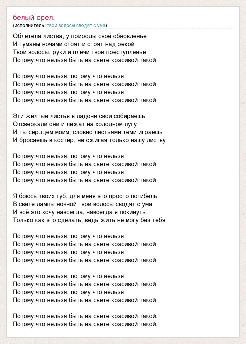 Облетела листва, у природы своё обновленье И туманы ночами стоят и стоят над рекой Твои волосы, руки и плечи твои преступленье Потому что нельзя быть на свете красивой такой Потому что нельзя, потому что нельзя Потому что нельзя быть на свете красивой такой Потому что нельзя, потому что нельзя Потому что нельзя быть на свете красивой такой Эти жёлтые листья в ладони свои собираешь Отсверкали они и лежат на холодном лугу И ты сердцем моим, словно листьями теми играешь И бросаешь в костёр, не сжигая только нашу листву Потому что нельзя, потому что нельзя Потому что нельзя быть на свете красивой такой Потому что нельзя, потому что нельзя Потому что нельзя быть на свете красивой такой Я боюсь твоих губ, для меня это просто погибель В свете лампы ночной твои волосы сводят с ума И всё это хочу навсегда, навсегда я покинуть Только как это сделать, ведь жить не могу без тебя Потому что нельзя, потому что нельзя Потому что нельзя быть на свете красивой такой Потому что нельзя, потому что нельзя Потому что нельзя быть на свете красивой такой Потому что нельзя, потому что нельзя Потому что нельзя быть на свете красивой такой Потому что нельзя, потому что нельзя Потому что нельзя быть на свете красивой такой Потому что нельзя быть на свете красивой такой. Потому что нельзя быть на свете красивой такой.