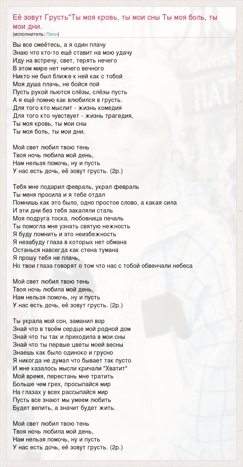 Вы все смеётесь, а я один плачу Знаю что кто-то ещё ставит на мою удачу Иду на встречу, свет, терять нечего В этом мире нет ничего вечного Никто не был ближе к ней как с тобой Моя душа плачь, не бойся пой Пусть рукой льются слёзы, слёзы пусть А я ещё помню как влюбился в грусть. Для того кто мыслит - жизнь комедия Для того кто чувствует - жизнь трагедия, Ты моя кровь, ты мои сны Ты моя боль, ты мои дни. Мой свет любил твою тень Твоя ночь любила мой день, Нам нельзя помочь, ну и пусть У нас есть дочь, её зовут грусть. (2р.) Тебя мне подарил февраль, украл февраль Ты меня просила и я тебе отдал Помнишь как это было, одно простое слово, а какая сила И эти дни без тебя закаляли сталь Моя подруга тоска, любовница печаль Ты помогла мне узнать святую нежность Я буду помнить и это неизбежность Я незабуду глаза в которых нет обмана Останься навсегда как стена тумана Я прошу тебя не плачь, Но твои глаза говорят о том что нас с тобой обвенчали небеса Мой свет любил твою тень Твоя ночь любила мой день, Нам нельзя помочь, ну и пусть У нас есть дочь, её зовут грусть. (2р.) Ты украла мой сон, заманил вор Знай что в твоём сердце мой родной дом Знай что ты так и приходила в мои сны Знай что ты первые цветы моей весны Знаешь как было одиноко и грусно Я никогда не думал что бывает так пусто И мне казалось мысли кричали "Хватит" Мой время, перестань мне тратить Больше чем грех, просыпайся мир На глазах у всех рассыпайся мир Пусть все знают мы умеем любить Будет вепить, а значит будет жить. Мой свет любил твою тень Твоя ночь любила мой день, Нам нельзя помочь, ну и пусть У нас есть дочь, её зовут грусть. (2р.)