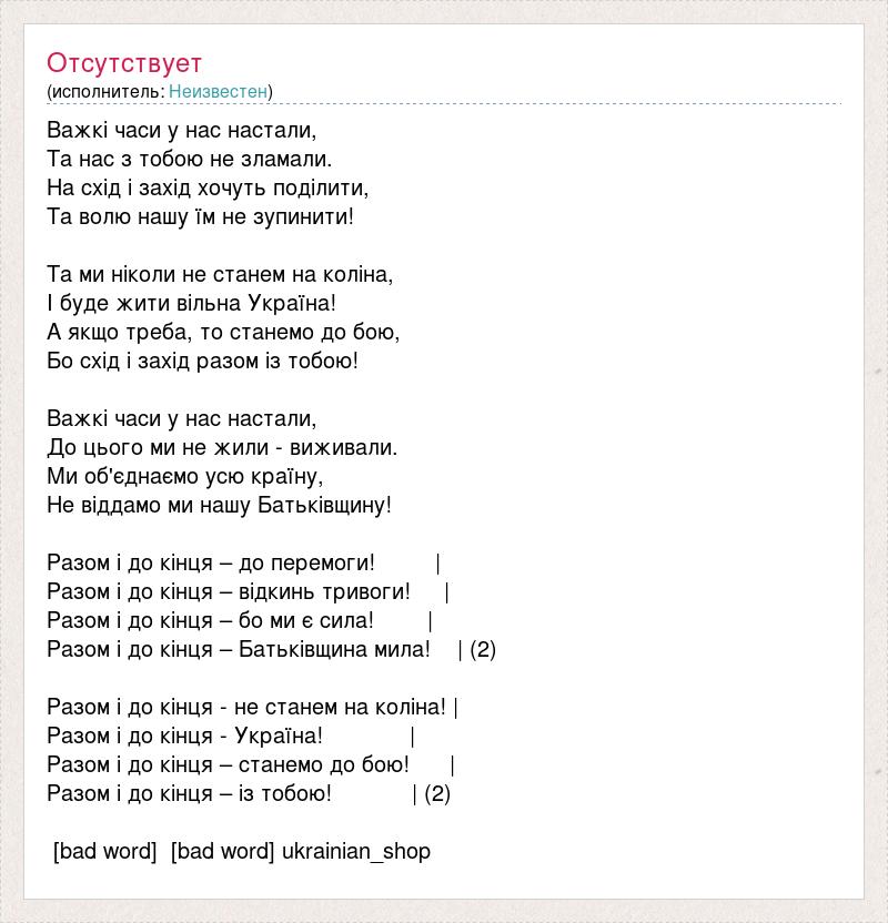 Важкі часи у нас настали, Та нас з тобою не зламали. На схід і захід хочуть поділити, Та волю нашу їм не зупинити! Та ми ніколи не станем на коліна, І буде жити вільна Україна! А якщо треба, то станемо до бою, Бо схід і захід разом із тобою! Важкі часи у нас настали, До цього ми не жили - виживали. Ми об'єднаємо усю країну, Не віддамо ми нашу Батьківщину! Разом і до кінця – до перемоги! | Разом і до кінця – відкинь тривоги! | Разом і до кінця – бо ми є сила! | Разом і до кінця – Батьківщина мила! | (2) Разом і до кінця - не станем на коліна! | Разом і до кінця - Україна! | Разом і до кінця – станемо до бою! | Разом і до кінця – із тобою! | (2) [bad word] [bad word] ukrainian_shop