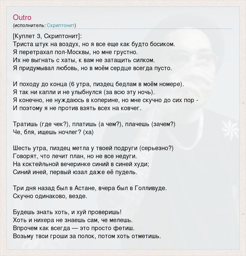 [Куплет 3, Скриптонит]: Триста штук на воздух, но я все еще как будто босиком. Я перетрахал пол-Москвы, но мне грустно. Их не выгнать с хаты, к вам не затащить силком. Я придумывал любовь, но в моём сердце всегда пусто. И походу до конца (6 утра, пиздец бедлам в моём номере). Я так ни капли и не улыбнулся (за всю эту ночь). Я конечно, не нуждаюсь в коперине, но мне скучно до сих пор - И поэтому я не против взять всех на ковчег. Тратишь (где чек?), платишь (а чем?), плачешь (зачем?) Че, бля, ищешь ночлег? (ха) Шесть утра, пиздец метла у твоей подруги (серьезно?) Говорят, что лечит план, но не все недуги. На коктейльной вечеринке синий в синей худи; Синий иней, первый юзал даже её пудель. Три дня назад был в Астане, вчера был в Голливуде. Скучно одинаково, везде. Будешь знать хоть, и хуй проверишь! Хоть и нихера не знаешь сам, че мелешь. Впрочем как всегда — это просто фетиш. Возьму твои гроши за полок, потом хоть отметишь.