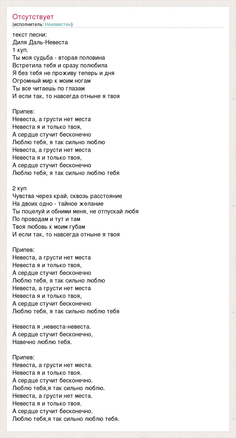 текст песни: Диля Даль-Невеста 1 куп. Ты моя судьба - вторая половина Встретила тебя и сразу полюбила Я без тебя не проживу теперь и дня Огромный мир к моим ногам Ты все читаешь по глазам И если так, то навсегда отныне я твоя Припев: Невеста, а грусти нет места Невеста я и только твоя, А сердце стучит бесконечно Люблю тебя, я так сильно люблю Невеста, а грусти нет места Невеста я и только твоя, А сердце стучит бесконечно Люблю тебя, я так сильно люблю тебя 2 куп Чувства через край, сквозь расстояние На двоих одно - тайное желание Ты поцелуй и обними меня, не отпускай любя По проводам и тут и там Твоя любовь к моим губам И если так, то навсегда отныне я твоя Припев: Невеста, а грусти нет места Невеста я и только твоя, А сердце стучит бесконечно Люблю тебя, я так сильно люблю Невеста, а грусти нет места Невеста я и только твоя, А сердце стучит бесконечно Люблю тебя, я так сильно люблю тебя Невеста я ,невеста-невеста. А сердце стучит бесконечно, Навечно люблю тебя. Припев: Невеста, а грусти нет места. Невеста я и только твоя. А сердце стучит бесконечно. Люблю тебя,я так сильно люблю. Невеста, а грусти нет места. Невеста я и только твоя. А сердце стучит бесконечно. Люблю тебя,я так сильно люблю тебя.