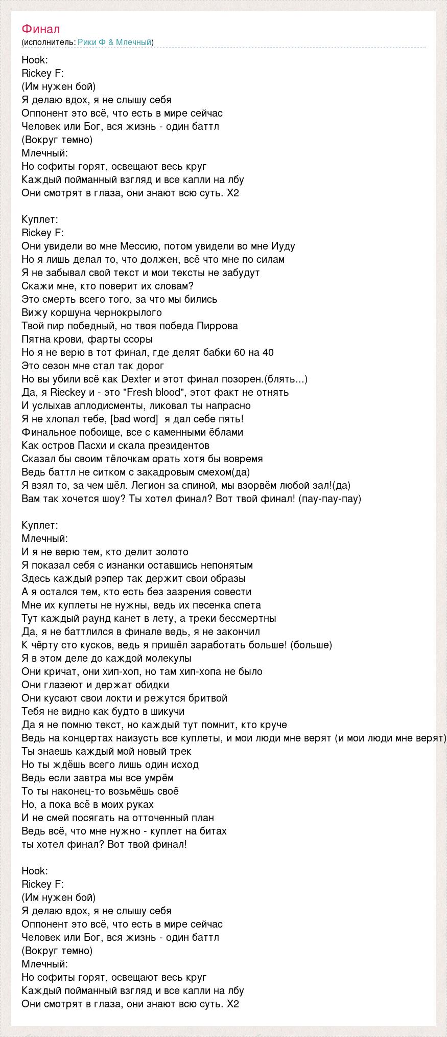 Hook: Rickey F: (Им нужен бой) Я делаю вдох, я не слышу себя Оппонент это всё, что есть в мире сейчас Человек или Бог, вся жизнь - один баттл (Вокруг темно) Млечный: Но софиты горят, освещают весь круг Каждый пойманный взгляд и все капли на лбу Они смотрят в глаза, они знают всю суть. X2 Куплет: Rickey F: Они увидели во мне Мессию, потом увидели во мне Иуду Но я лишь делал то, что должен, всё что мне по силам Я не забывал свой текст и мои тексты не забудут Скажи мне, кто поверит их словам? Это смерть всего того, за что мы бились Вижу коршуна чернокрылого Твой пир победный, но твоя победа Пиррова Пятна крови, фарты ссоры Hо я не верю в тот финал, где делят бабки 60 на 40 Это сезон мне стал так дорог Но вы убили всё как Dexter и этот финал позорен.(блять...) Да, я Rieckey и - это "Fresh blood", этот факт не отнять И услыхав аплодисменты, ликовал ты напрасно Я не хлопал тебе, [bad word] я дал себе пять! Финальное побоище, все с каменными ёблами Как остров Пасхи и скала президентов Сказал бы своим тёлочкам орать хотя бы вовремя Ведь баттл не ситком с закадровым смехом(да) Я взял то, за чем шёл. Легион за спиной, мы взорвём любой зал!(да) Вам так хочется шоу? Ты хотел финал? Вот твой финал! (пау-пау-пау) Куплет: Млечный: И я не верю тем, кто делит золото Я показал себя с изнанки оставшись непонятым Здесь каждый рэпер так держит свои образы А я остался тем, кто есть без зазрения совести Мне их куплеты не нужны, ведь их песенка спета Тут каждый раунд канет в лету, а треки бессмертны Да, я не баттлился в финале ведь, я не закончил К чёрту сто кусков, ведь я пришёл заработать больше! (больше) Я в этом деле до каждой молекулы Они кричат, они хип-хоп, но там хип-хопа не было Они глазеют и держат обидки Они кусают свои локти и режутся бритвой Тебя не видно как будто в шикучи Да я не помню текст, но каждый тут помнит, кто круче Ведь на концертах наизусть все куплеты, и мои люди мне верят (и мои люди мне верят) Ты знаешь каждый мой новый трек Но ты ждёшь всего лишь один исход Ведь если завтра мы все умрём То ты наконец-то возьмёшь своё Но, а пока всё в моих руках И не смей посягать на отточенный план Ведь всё, что мне нужно - куплет на битах ты хотел финал? Вот твой финал! Hook: Rickey F: (Им нужен бой) Я делаю вдох, я не слышу себя Оппонент это всё, что есть в мире сейчас Человек или Бог, вся жизнь - один баттл (Вокруг темно) Млечный: Но софиты горят, освещают весь круг Каждый пойманный взгляд и все капли на лбу Они смотрят в глаза, они знают всю суть. X2