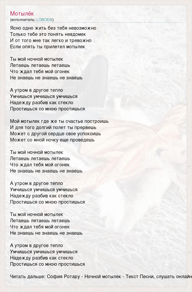 Ясно одно жить без тебя невозможно Только тебе это понять невдомек И от того мне так легко и тревожно Если опять ты прилетел мотылек Ты мой ночной мотылек Летаешь летаешь летаешь Что ждал тебя мой огонек Не знаешь не знаешь не знаешь А утром в другое тепло Умчишься умчишься умчишься Надежду разбив как стекло Простишься со мною простишься Мой мотылек где же ты счастье построишь И для того долгий полет ты прервешь Может с другой сердце свое успокоишь Может со мной ночку еще проведешь Ты мой ночной мотылек Летаешь летаешь летаешь Что ждал тебя мой огонек Не знаешь не знаешь не знаешь А утром в другое тепло Умчишься умчишься умчишься Надежду разбив как стекло Простишься со мною простишься Ты мой ночной мотылек Летаешь летаешь летаешь Что ждал тебя мой огонек Не знаешь не знаешь не знаешь А утром в другое тепло Умчишься умчишься умчишься Надежду разбив как стекло Простишься со мною простишься Читать дальше: София Ротару - Ночной мотылек - Текст Песни, слушать онлайн
