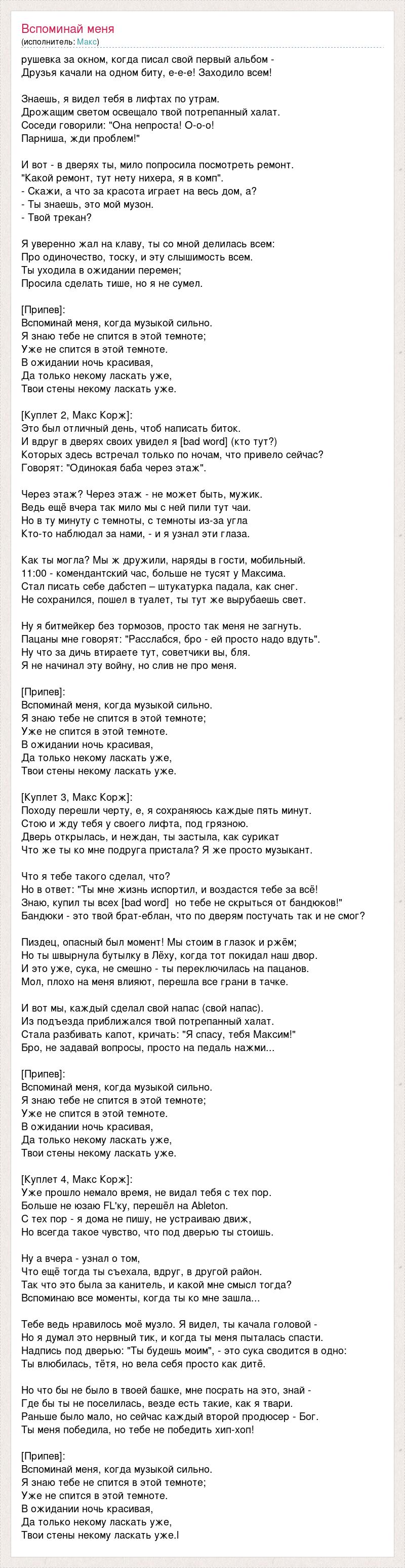 рушевка за окном, когда писал свой первый альбом - Друзья качали на одном биту, е-е-е! Заходило всем! Знаешь, я видел тебя в лифтах по утрам. Дрожащим светом освещало твой потрепанный халат. Соседи говорили: "Она непроста! О-о-о! Парниша, жди проблем!" И вот - в дверях ты, мило попросила посмотреть ремонт. "Какой ремонт, тут нету нихера, я в комп". - Скажи, а что за красота играет на весь дом, а? - Ты знаешь, это мой музон. - Твой трекан? Я уверенно жал на клаву, ты со мной делилась всем: Про одиночество, тоску, и эту слышимость всем. Ты уходила в ожидании перемен; Просила сделать тише, но я не сумел. [Припев]: Вспоминай меня, когда музыкой сильно. Я знаю тебе не спится в этой темноте; Уже не спится в этой темноте. В ожидании ночь красивая, Да только некому ласкать уже, Твои стены некому ласкать уже. [Куплет 2, Макс Корж]: Это был отличный день, чтоб написать биток. И вдруг в дверях своих увидел я [bad word] (кто тут?) Которых здесь встречал только по ночам, что привело сейчас? Говорят: "Одинокая баба через этаж". Через этаж? Через этаж - не может быть, мужик. Ведь ещё вчера так мило мы с ней пили тут чаи. Но в ту минуту с темноты, с темноты из-за угла Кто-то наблюдал за нами, - и я узнал эти глаза. Как ты могла? Мы ж дружили, наряды в гости, мобильный. 11:00 - комендантский час, больше не тусят у Максима. Стал писать себе дабстеп – штукатурка падала, как снег. Не сохранился, пошел в туалет, ты тут же вырубаешь свет. Ну я битмейкер без тормозов, просто так меня не загнуть. Пацаны мне говорят: "Расслабся, бро - ей просто надо вдуть". Ну что за дичь втираете тут, советчики вы, бля. Я не начинал эту войну, но слив не про меня. [Припев]: Вспоминай меня, когда музыкой сильно. Я знаю тебе не спится в этой темноте; Уже не спится в этой темноте. В ожидании ночь красивая, Да только некому ласкать уже, Твои стены некому ласкать уже. [Куплет 3, Макс Корж]: Походу перешли черту, е, я сохраняюсь каждые пять минут. Стою и жду тебя у своего лифта, под грязною. Дверь открылась, и неждан, ты застыла, как сурикат Что же ты ко мне подруга пристала? Я же просто музыкант. Что я тебе такого сделал, что? Но в ответ: "Ты мне жизнь испортил, и воздастся тебе за всё! Знаю, купил ты всех [bad word] но тебе не скрыться от бандюков!" Бандюки - это твой брат-еблан, что по дверям постучать так и не смог? Пиздец, опасный был момент! Мы стоим в глазок и ржём; Но ты швырнула бутылку в Лёху, когда тот покидал наш двор. И это уже, сука, не смешно - ты переключилась на пацанов. Мол, плохо на меня влияют, перешла все грани в тачке. И вот мы, каждый сделал свой напас (свой напас). Из подъезда приближался твой потрепанный халат. Стала разбивать капот, кричать: "Я спасу, тебя Максим!" Бро, не задавай вопросы, просто на педаль нажми... [Припев]: Вспоминай меня, когда музыкой сильно. Я знаю тебе не спится в этой темноте; Уже не спится в этой темноте. В ожидании ночь красивая, Да только некому ласкать уже, Твои стены некому ласкать уже. [Куплет 4, Макс Корж]: Уже прошло немало время, не видал тебя с тех пор. Больше не юзаю FL'ку, перешёл на Ableton. С тех пор - я дома не пишу, не устраиваю движ, Но всегда такое чувство, что под дверью ты стоишь. Ну а вчера - узнал о том, Что ещё тогда ты съехала, вдруг, в другой район. Так что это была за канитель, и какой мне смысл тогда? Вспоминаю все моменты, когда ты ко мне зашла... Тебе ведь нравилось моё музло. Я видел, ты качала головой - Но я думал это нервный тик, и