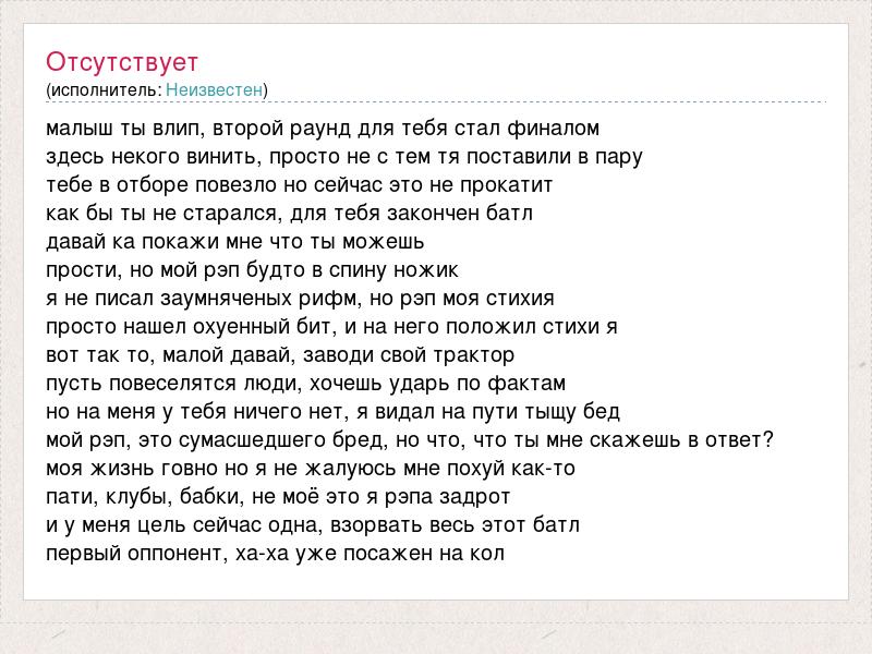 малыш ты влип, второй раунд для тебя стал финалом здесь некого винить, просто не с тем тя поставили в пару тебе в отборе повезло но сейчас это не прокатит как бы ты не старался, для тебя закончен батл давай ка покажи мне что ты можешь прости, но мой рэп будто в спину ножик я не писал заумняченых рифм, но рэп моя стихия просто нашел охуенный бит, и на него положил стихи я вот так то, малой давай, заводи свой трактор пусть повеселятся люди, хочешь ударь по фактам но на меня у тебя ничего нет, я видал на пути тыщу бед мой рэп, это сумасшедшего бред, но что, что ты мне скажешь в ответ? моя жизнь говно но я не жалуюсь мне похуй как-то пати, клубы, бабки, не моё это я рэпа задрот и у меня цель сейчас одна, взорвать весь этот батл первый оппонент, ха-ха уже посажен на кол