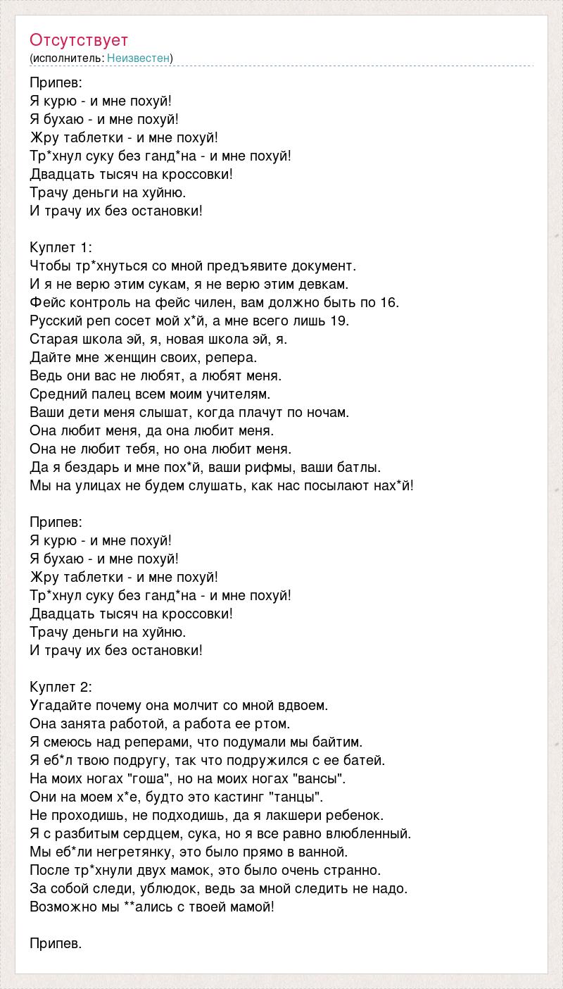Припев: Я курю - и мне похуй! Я бухаю - и мне похуй! Жру таблетки - и мне похуй! Тр*хнул суку без ганд*на - и мне похуй! Двадцать тысяч на кроссовки! Трачу деньги на хуйню. И трачу их без остановки! Куплет 1: Чтобы тр*хнуться со мной предъявите документ. И я не верю этим сукам, я не верю этим девкам. Фейс контроль на фейс чилен, вам должно быть по 16. Русский реп сосет мой х*й, а мне всего лишь 19. Старая школа эй, я, новая школа эй, я. Дайте мне женщин своих, репера. Ведь они вас не любят, а любят меня. Средний палец всем моим учителям. Ваши дети меня слышат, когда плачут по ночам. Она любит меня, да она любит меня. Она не любит тебя, но она любит меня. Да я бездарь и мне пох*й, ваши рифмы, ваши батлы. Мы на улицах не будем слушать, как нас посылают нах*й! Припев: Я курю - и мне похуй! Я бухаю - и мне похуй! Жру таблетки - и мне похуй! Тр*хнул суку без ганд*на - и мне похуй! Двадцать тысяч на кроссовки! Трачу деньги на хуйню. И трачу их без остановки! Куплет 2: Угадайте почему она молчит со мной вдвоем. Она занята работой, а работа ее ртом. Я смеюсь над реперами, что подумали мы байтим. Я еб*л твою подругу, так что подружился с ее батей. На моих ногах "гоша", но на моих ногах "вансы". Они на моем х*е, будто это кастинг "танцы". Не проходишь, не подходишь, да я лакшери ребенок. Я с разбитым сердцем, сука, но я все равно влюбленный. Мы еб*ли негретянку, это было прямо в ванной. После тр*хнули двух мамок, это было очень странно. За собой следи, ублюдок, ведь за мной следить не надо. Возможно мы **ались с твоей мамой! Припев.
