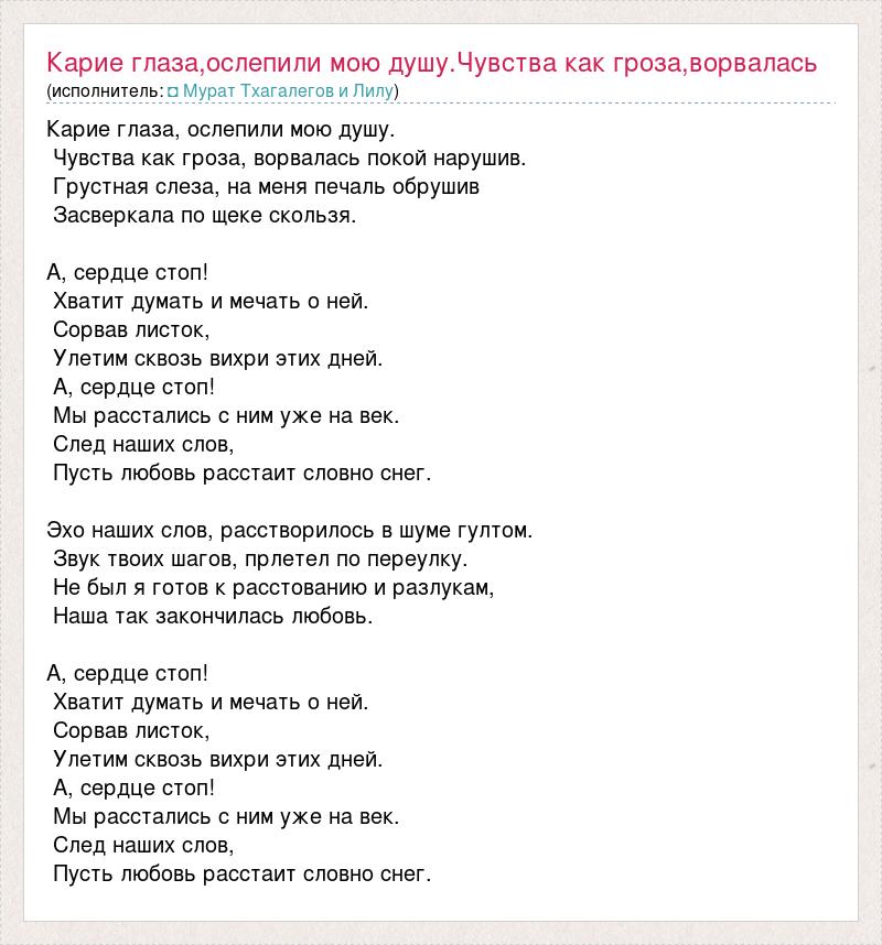 Карие глаза, ослепили мою душу. Чувства как гроза, ворвалась покой нарушив. Грустная слеза, на меня печаль обрушив Засверкала по щеке скользя. А, сердце стоп! Хватит думать и мечать о ней. Сорвав листок, Улетим сквозь вихри этих дней. А, сердце стоп! Мы расстались с ним уже на век. След наших слов, Пусть любовь расстаит словно снег. Эхо наших слов, расстворилось в шуме гултом. Звук твоих шагов, прлетел по переулку. Не был я готов к расстованию и разлукам, Наша так закончилась любовь. А, сердце стоп! Хватит думать и мечать о ней. Сорвав листок, Улетим сквозь вихри этих дней. А, сердце стоп! Мы расстались с ним уже на век. След наших слов, Пусть любовь расстаит словно снег.