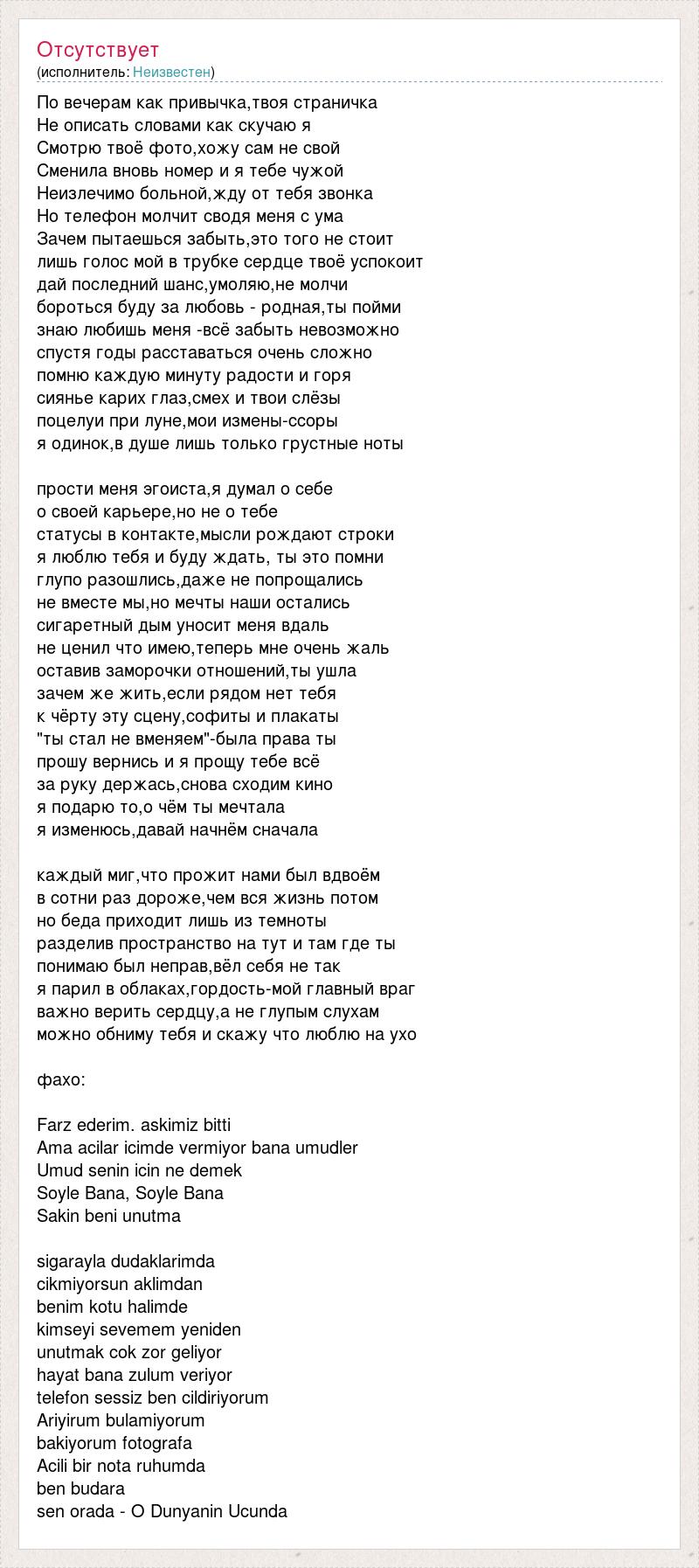 По вечерам как привычка,твоя страничка Не описать словами как скучаю я Смотрю твоё фото,хожу сам не свой Сменила вновь номер и я тебе чужой Неизлечимо больной,жду от тебя звонка Но телефон молчит сводя меня с ума Зачем пытаешься забыть,это того не стоит лишь голос мой в трубке сердце твоё успокоит дай последний шанс,умоляю,не молчи бороться буду за любовь - родная,ты пойми знаю любишь меня -всё забыть невозможно спустя годы расставаться очень сложно помню каждую минуту радости и горя сиянье карих глаз,смех и твои слёзы поцелуи при луне,мои измены-ссоры я одинок,в душе лишь только грустные ноты прости меня эгоиста,я думал о себе о своей карьере,но не о тебе статусы в контакте,мысли рождают строки я люблю тебя и буду ждать, ты это помни глупо разошлись,даже не попрощались не вместе мы,но мечты наши остались сигаретный дым уносит меня вдаль не ценил что имею,теперь мне очень жаль оставив заморочки отношений,ты ушла зачем же жить,если рядом нет тебя к чёрту эту сцену,софиты и плакаты "ты стал не вменяем"-была права ты прошу вернись и я прощу тебе всё за руку держась,снова сходим кино я подарю то,о чём ты мечтала я изменюсь,давай начнём сначала каждый миг,что прожит нами был вдвоём в сотни раз дороже,чем вся жизнь потом но беда приходит лишь из темноты разделив пространство на тут и там где ты понимаю был неправ,вёл себя не так я парил в облаках,гордость-мой главный враг важно верить сердцу,а не глупым слухам можно обниму тебя и скажу что люблю на ухо фахо: Farz ederim. askimiz bitti Ama acilar icimde vermiyor bana umudler Umud senin icin ne demek Soyle Bana, Soyle Bana Sakin beni unutma sigarayla dudaklarimda cikmiyorsun aklimdan benim kotu halimde kimseyi sevemem yeniden unutmak cok zor geliyor hayat bana zulum veriyor telefon sessiz ben cildiriyorum Ariyirum bulamiyorum bakiyorum fotografa Acili bir nota ruhumda ben budara sen orada - O Dunyanin Ucunda