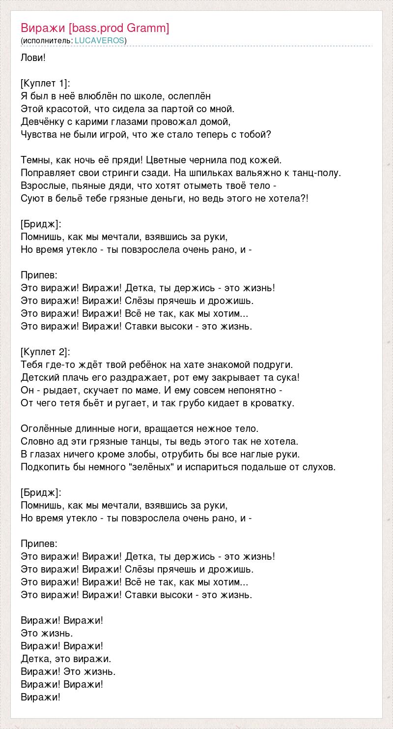 Лови! [Куплет 1]: Я был в неё влюблён по школе, ослеплён Этой красотой, что сидела за партой со мной. Девчёнку с карими глазами провожал домой, Чувства не были игрой, что же стало теперь с тобой? Темны, как ночь её пряди! Цветные чернила под кожей. Поправляет свои стринги сзади. На шпильках вальяжно к танц-полу. Взрослые, пьяные дяди, что хотят отыметь твоё тело - Суют в бельё тебе грязные деньги, но ведь этого не хотела?! [Бридж]: Помнишь, как мы мечтали, взявшись за руки, Но время утекло - ты повзрослела очень рано, и - Припев: Это виражи! Виражи! Детка, ты держись - это жизнь! Это виражи! Виражи! Слёзы прячешь и дрожишь. Это виражи! Виражи! Всё не так, как мы хотим... Это виражи! Виражи! Ставки высоки - это жизнь. [Куплет 2]: Тебя где-то ждёт твой ребёнок на хате знакомой подруги. Детский плачь его раздражает, рот ему закрывает та сука! Он - рыдает, скучает по маме. И ему совсем непонятно - От чего тетя бьёт и ругает, и так грубо кидает в кроватку. Оголённые длинные ноги, вращается нежное тело. Словно ад эти грязные танцы, ты ведь этого так не хотела. В глазах ничего кроме злобы, отрубить бы все наглые руки. Подкопить бы немного "зелёных" и испариться подальше от слухов. [Бридж]: Помнишь, как мы мечтали, взявшись за руки, Но время утекло - ты повзрослела очень рано, и - Припев: Это виражи! Виражи! Детка, ты держись - это жизнь! Это виражи! Виражи! Слёзы прячешь и дрожишь. Это виражи! Виражи! Всё не так, как мы хотим... Это виражи! Виражи! Ставки высоки - это жизнь. Виражи! Виражи! Это жизнь. Виражи! Виражи! Детка, это виражи. Виражи! Это жизнь. Виражи! Виражи! Виражи!