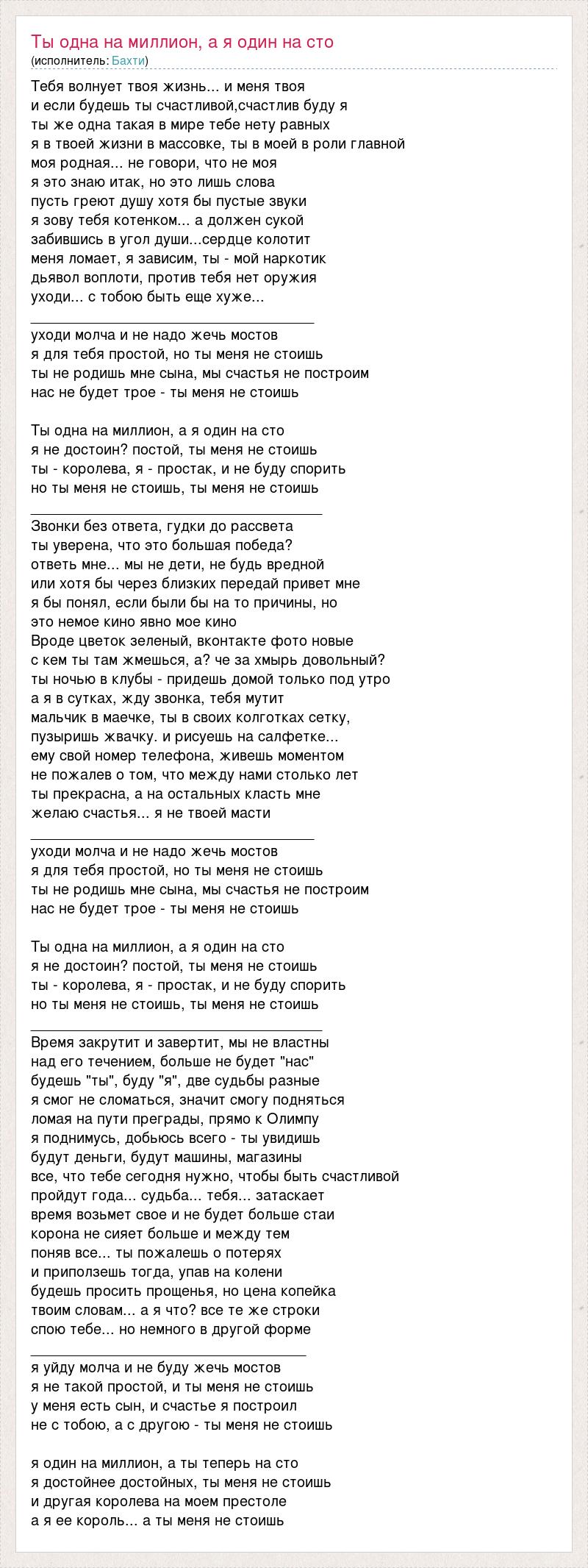 Тебя волнует твоя жизнь... и меня твоя и если будешь ты счастливой,счастлив буду я ты же одна такая в мире тебе нету равных я в твоей жизни в массовке, ты в моей в роли главной моя родная... не говори, что не моя я это знаю итак, но это лишь слова пусть греют душу хотя бы пустые звуки я зову тебя котенком... а должен сукой забившись в угол души...сердце колотит меня ломает, я зависим, ты - мой наркотик дьявол воплоти, против тебя нет оружия уходи... с тобою быть еще хуже... ___________________________________ уходи молча и не надо жечь мостов я для тебя простой, но ты меня не стоишь ты не родишь мне сына, мы счастья не построим нас не будет трое - ты меня не стоишь Ты одна на миллион, а я один на сто я не достоин? постой, ты меня не стоишь ты - королева, я - простак, и не буду спорить но ты меня не стоишь, ты меня не стоишь ____________________________________ Звонки без ответа, гудки до рассвета ты уверена, что это большая победа? ответь мне... мы не дети, не будь вредной или хотя бы через близких передай привет мне я бы понял, если были бы на то причины, но это немое кино явно мое кино Вроде цветок зеленый, вконтакте фото новые с кем ты там жмешься, а? че за хмырь довольный? ты ночью в клубы - придешь домой только под утро а я в сутках, жду звонка, тебя мутит мальчик в маечке, ты в своих колготках сетку, пузыришь жвачку. и рисуешь на салфетке... ему свой номер телефона, живешь моментом не пожалев о том, что между нами столько лет ты прекрасна, а на остальных класть мне желаю счастья... я не твоей масти ___________________________________ уходи молча и не надо жечь мостов я для тебя простой, но ты меня не стоишь ты не родишь мне сына, мы счастья не построим нас не будет трое - ты меня не стоишь Ты одна на миллион, а я один на сто я не достоин? постой, ты меня не стоишь ты - королева, я - простак, и не буду спорить но ты меня не стоишь, ты меня не стоишь ____________________________________ Время закрутит и завертит, мы не властны над его течением, больше не будет "нас" будешь "ты", буду "я", две судьбы разные я смог не сломаться, значит смогу подняться ломая на пути преграды, прямо к Олимпу я поднимусь, добьюсь всего - ты увидишь будут деньги, будут машины, магазины все, что тебе сегодня нужно, чтобы быть счастливой пройдут года... судьба... тебя... затаскает время возьмет свое и не будет больше стаи корона не сияет больше и между тем поняв все... ты пожалешь о потерях и приползешь тогда, упав на колени будешь просить прощенья, но цена копейка твоим словам... а я что? все те же строки спою тебе... но немного в другой форме __________________________________ я уйду молча и не буду жечь мостов я не такой простой, и ты меня не стоишь у меня есть сын, и счастье я построил не с тобою, а с другою - ты меня не стоишь я один на миллион, а ты теперь на сто я достойнее достойных, ты меня не стоишь и другая королева на моем престоле а я ее король... а ты меня не стоишь