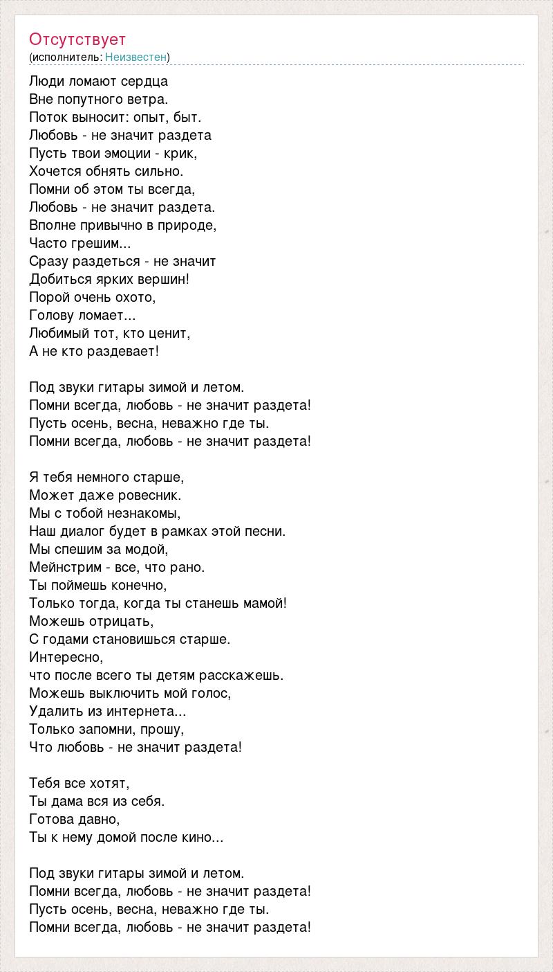 Люди ломают сердца Вне попутного ветра. Поток выносит: опыт, быт. Любовь - не значит раздета Пусть твои эмоции - крик, Хочется обнять сильно. Помни об этом ты всегда, Любовь - не значит раздета. Вполне привычно в природе, Часто грешим... Сразу раздеться - не значит Добиться ярких вершин! Порой очень охото, Голову ломает... Любимый тот, кто ценит, А не кто раздевает! Под звуки гитары зимой и летом. Помни всегда, любовь - не значит раздета! Пусть осень, весна, неважно где ты. Помни всегда, любовь - не значит раздета! Я тебя немного старше, Может даже ровесник. Мы с тобой незнакомы, Наш диалог будет в рамках этой песни. Мы спешим за модой, Мейнстрим - все, что рано. Ты поймешь конечно, Только тогда, когда ты станешь мамой! Можешь отрицать, С годами становишься старше. Интересно, что после всего ты детям расскажешь. Можешь выключить мой голос, Удалить из интернета... Только запомни, прошу, Что любовь - не значит раздета! Тебя все хотят, Ты дама вся из себя. Готова давно, Ты к нему домой после кино... Под звуки гитары зимой и летом. Помни всегда, любовь - не значит раздета! Пусть осень, весна, неважно где ты. Помни всегда, любовь - не значит раздета!