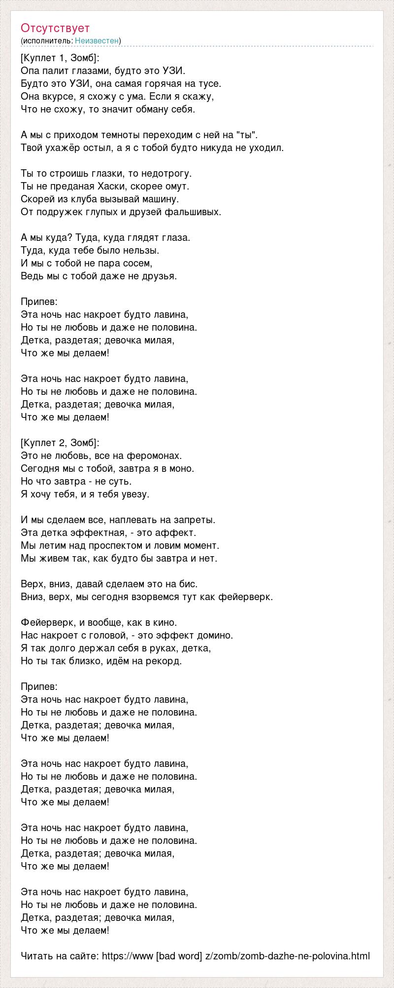 [Куплет 1, Зомб]: Опа палит глазами, будто это УЗИ. Будто это УЗИ, она самая горячая на тусе. Она вкурсе, я схожу с ума. Если я скажу, Что не схожу, то значит обману себя. А мы с приходом темноты переходим с ней на "ты". Твой ухажёр остыл, а я с тобой будто никуда не уходил. Ты то строишь глазки, то недотрогу. Ты не преданая Хаски, скорее омут. Скорей из клуба вызывай машину. От подружек глупых и друзей фальшивых. А мы куда? Туда, куда глядят глаза. Туда, куда тебе было нельзы. И мы с тобой не пара сосем, Ведь мы с тобой даже не друзья. Припев: Эта ночь нас накроет будто лавина, Но ты не любовь и даже не половина. Детка, раздетая; девочка милая, Что же мы делаем! Эта ночь нас накроет будто лавина, Но ты не любовь и даже не половина. Детка, раздетая; девочка милая, Что же мы делаем! [Куплет 2, Зомб]: Это не любовь, все на феромонах. Сегодня мы с тобой, завтра я в моно. Но что завтра - не суть. Я хочу тебя, и я тебя увезу. И мы сделаем все, наплевать на запреты. Эта детка эффектная, - это аффект. Мы летим над проспектом и ловим момент. Мы живем так, как будто бы завтра и нет. Верх, вниз, давай сделаем это на бис. Вниз, верх, мы сегодня взорвемся тут как фейерверк. Фейерверк, и вообще, как в кино. Нас накроет с головой, - это эффект домино. Я так долго держал себя в руках, детка, Но ты так близко, идём на рекорд. Припев: Эта ночь нас накроет будто лавина, Но ты не любовь и даже не половина. Детка, раздетая; девочка милая, Что же мы делаем! Эта ночь нас накроет будто лавина, Но ты не любовь и даже не половина. Детка, раздетая; девочка милая, Что же мы делаем! Эта ночь нас накроет будто лавина, Но ты не любовь и даже не половина. Детка, раздетая; девочка милая, Что же мы делаем! Эта ночь нас накроет будто лавина, Но ты не любовь и даже не половина. Детка, раздетая; девочка милая, Что же мы делаем! Читать на сайте: https://www [bad word] z/zomb/zomb-dazhe-ne-polovina.html