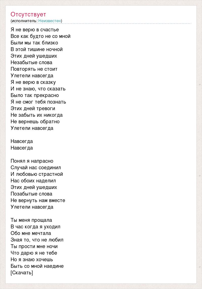 Я не верю в счастье Все как будто не со мной Были мы так близко В этой тишине ночной Этих дней ушедших Незабытые слова Повторять не стоит Улетели навсегда Я не верю в сказку И не знаю, что сказать Было так прекрасно Я не смог тебя познать Этих дней тревоги Не забыть их никогда Не вернешь обратно Улетели навсегда Навсегда Навсегда Понял я напрасно Случай нас соединил И любовью страстной Нас обоих наделил Этих дней ушедших Позабытые слова Не вернуть нам вместе Улетели навсегда Ты меня прощала В час когда я уходил Обо мне мечтала Зная то, что не любил Ты прости мне ночи Что дарю я не тебе Но я знаю хочешь Быть со мной наедине [Скачать]