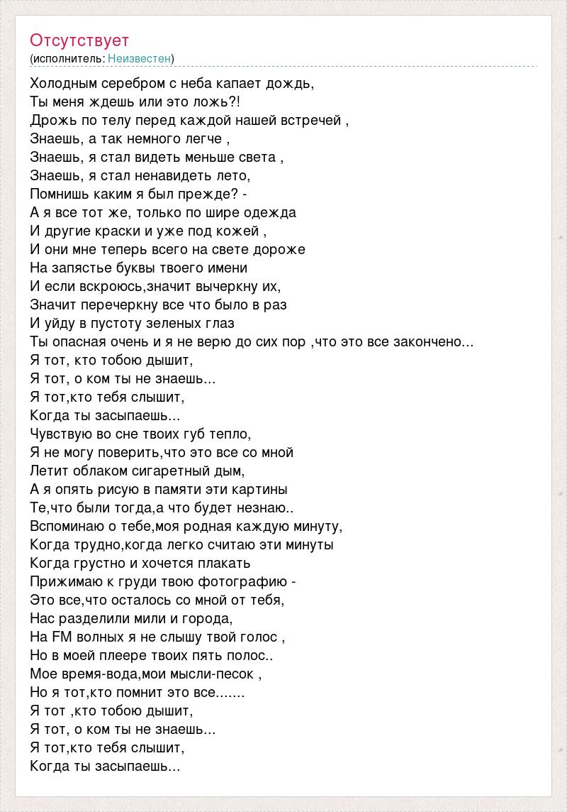 Холодным серебром с неба капает дождь, Ты меня ждешь или это ложь?! Дрожь по телу перед каждой нашей встречей , Знаешь, а так немного легче , Знаешь, я стал видеть меньше света , Знаешь, я стал ненавидеть лето, Помнишь каким я был прежде? - А я все тот же, только по шире одежда И другие краски и уже под кожей , И они мне теперь всего на свете дороже На запястье буквы твоего имени И если вскроюсь,значит вычеркну их, Значит перечеркну все что было в раз И уйду в пустоту зеленых глаз Ты опасная очень и я не верю до сих пор ,что это все закончено... Я тот, кто тобою дышит, Я тот, о ком ты не знаешь... Я тот,кто тебя слышит, Когда ты засыпаешь... Чувствую во сне твоих губ тепло, Я не могу поверить,что это все со мной Летит облаком сигаретный дым, А я опять рисую в памяти эти картины Те,что были тогда,а что будет незнаю.. Вспоминаю о тебе,моя родная каждую минуту, Когда трудно,когда легко считаю эти минуты Когда грустно и хочется плакать Прижимаю к груди твою фотографию - Это все,что осталось со мной от тебя, Нас разделили мили и города, На FM волных я не слышу твой голос , Но в моей плеере твоих пять полос.. Мое время-вода,мои мысли-песок , Но я тот,кто помнит это все....... Я тот ,кто тобою дышит, Я тот, о ком ты не знаешь... Я тот,кто тебя слышит, Когда ты засыпаешь...