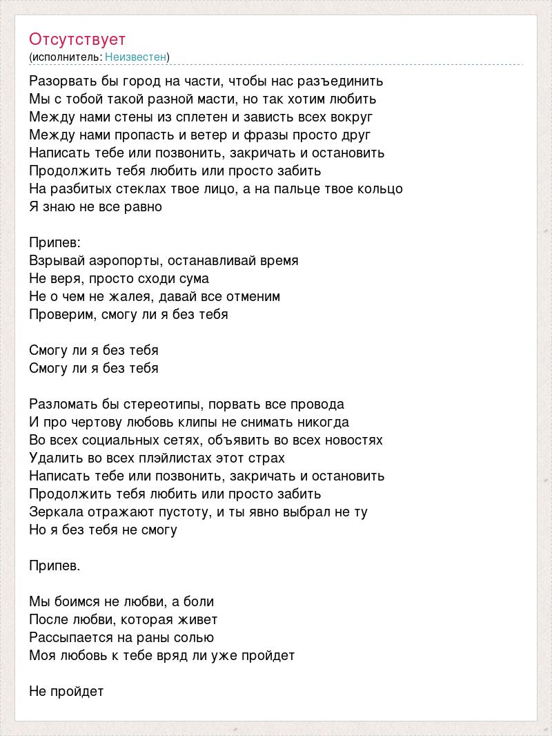 Разорвать бы город на части, чтобы нас разъединить Мы с тобой такой разной масти, но так хотим любить Между нами стены из сплетен и зависть всех вокруг Между нами пропасть и ветер и фразы просто друг Написать тебе или позвонить, закричать и остановить Продолжить тебя любить или просто забить На разбитых стеклах твое лицо, а на пальце твое кольцо Я знаю не все равно Припев: Взрывай аэропорты, останавливай время Не веря, просто сходи сума Не о чем не жалея, давай все отменим Проверим, смогу ли я без тебя Смогу ли я без тебя Смогу ли я без тебя Разломать бы стереотипы, порвать все провода И про чертову любовь клипы не снимать никогда Во всех социальных сетях, объявить во всех новостях Удалить во всех плэйлистах этот страх Написать тебе или позвонить, закричать и остановить Продолжить тебя любить или просто забить Зеркала отражают пустоту, и ты явно выбрал не ту Но я без тебя не смогу Припев. Мы боимся не любви, а боли После любви, которая живет Рассыпается на раны солью Моя любовь к тебе вряд ли уже пройдет Не пройдет