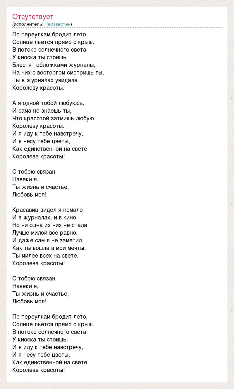 По переулкам бродит лето, Солнце льется прямо с крыш. В потоке солнечного света У киоска ты стоишь. Блестят обложками журналы, На них с восторгом смотришь ты, Ты в журналах увидала Королеву красоты. А я одной тобой любуюсь, И сама не знаешь ты, Что красотой затмишь любую Королеву красоты. И я иду к тебе навстречу, И я несу тебе цветы, Как единственной на свете Королеве красоты! С тобою связан Навеки я, Ты жизнь и счастье, Любовь моя! Красавиц видел я немало И в журналах, и в кино, Но ни одна из них не стала Лучше милой все равно. И даже сам я не заметил, Как ты вошла в мои мечты. Ты милее всех на свете. Королева красоты! С тобою связан Навеки я, Ты жизнь и счастье, Любовь моя! По переулкам бродит лето, Солнце льется прямо с крыш. В потоке солнечного света У киоска ты стоишь. И я иду к тебе навстречу, И я несу тебе цветы, Как единственной на свете Королеве красоты!
