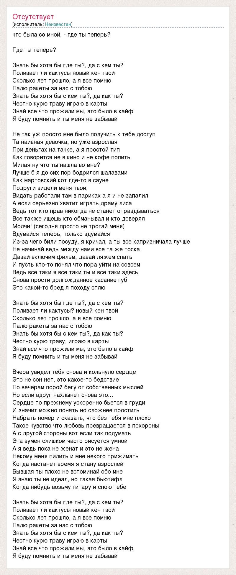 что была со мной, - где ты теперь? Где ты теперь? Знать бы хотя бы где ты?, да с кем ты? Поливает ли кактусы новый кен твой Сколько лет прошло, а я все помню Палю ракеты за нас с тобою Знать бы хотя бы с кем ты?, да как ты? Честно курю траву играю в карты Знай все что прожили мы, это было в кайф Я буду помнить и ты меня не забывай Не так уж просто мне было получить к тебе доступ Та наивная девочка, но уже взрослая При деньгах на тачке, а я простой тип Как говорится не в кино и не кофе попить Милая ну что ты нашла во мне? Лучше б я до сих пор бодрился шалавами Как мартовский кот где-то в сауне Подруги видели меня твои, Видать работали там в париках а я и не запалил А если серьезно хватит играть драму лиса Ведь тот кто прав никогда не станет оправдываться Все также ищешь кто обманывал и кто доверял Молчи! (сегодня просто не трогай меня) Вдумайся теперь, только вдумайся Из-за чего били посуду, я кричал, а ты все капризничала лучше Не начинай ведь между нами все та же тоска Давай включим фильм, давай ляжем спать И пусть кто-то понял что пора уйти на совсем Ведь все таки я все таки ты и все таки здесь Снова прости долгожданное касание губ Это какой-то бред я походу сплю Знать бы хотя бы где ты?, да с кем ты? Поливает ли кактусы? новый кен твой Сколько лет прошло, а я все помню Палю ракеты за нас с тобою Знать бы хотя бы с кем ты?, да как ты? Честно курю траву, играю в карты Знай все что прожили мы, это было в кайф Я буду помнить и ты меня не забывай Вчера увидел тебя снова и кольнуло сердце Это не сон нет, это какое-то бедствие По вечерам порой бегу от собственных мыслей Но если вдруг нахлынет снова это... Сердце по прежнему ускоренно бьется в груди И значит можно понять но сложнее простить Набрать номер и сказать, что без тебя мне плохо Такое чувство что любовь превращается в похороны А с другой стороны вот если так подумать Эта вумен слишком часто рисуется умной А я ведь пока не женат и это не жена Некому меня пилить и мне некого прижимать Когда настанет время я стану взрослей Бывшая ты плохо не вспоминай обо мне Я знаю ты не идеал, но такая бьютифл Когда нибудь возьму гитару и спою тебе Знать бы хотя бы где ты?, да с кем ты? Поливает ли кактусы новый кен твой Сколько лет прошло, а я все помню Палю ракеты за нас с тобою Знать бы хотя бы с кем ты?, да как ты? Честно курю траву играю в карты Знай все что прожили мы, это было в кайф Я буду помнить и ты меня не забывай