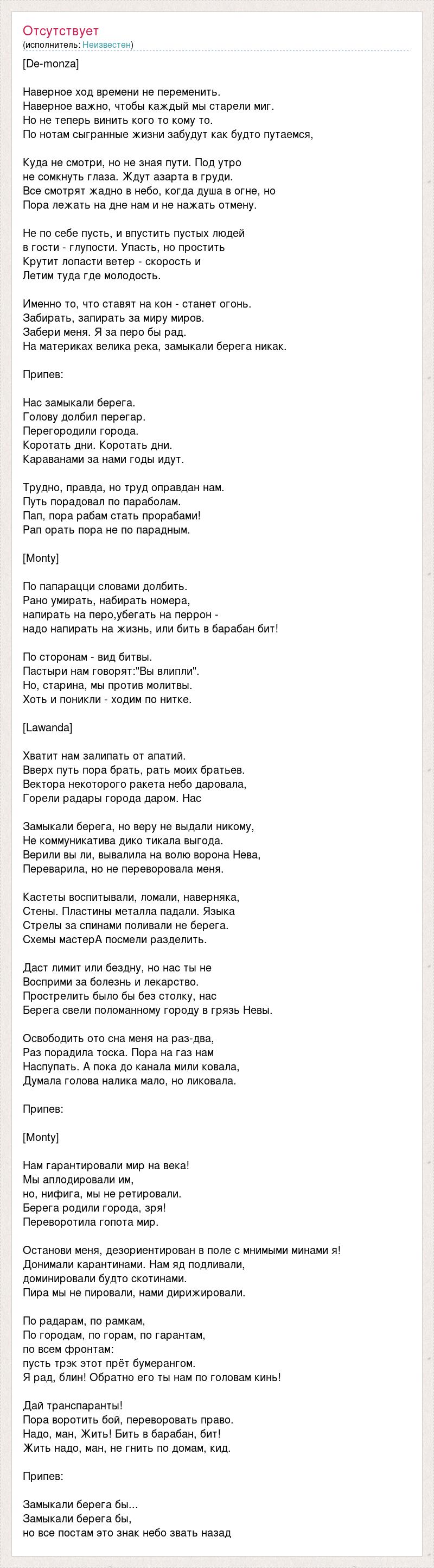 [De-monza] Наверное ход времени не переменить. Наверное важно, чтобы каждый мы старели миг. Но не теперь винить кого то кому то. По нотам сыгранные жизни забудут как будто путаемся, Куда не смотри, но не зная пути. Под утро не сомкнуть глаза. Ждут азарта в груди. Все смотрят жадно в небо, когда душа в огне, но Пора лежать на дне нам и не нажать отмену. Не по себе пусть, и впустить пустых людей в гости - глупости. Упасть, но простить Крутит лопасти ветер - скорость и Летим туда где молодость. Именно то, что ставят на кон - станет огонь. Забирать, запирать за миру миров. Забери меня. Я за перо бы рад. На материках велика река, замыкали берега никак. Припев: Нас замыкали берега. Голову долбил перегар. Перегородили города. Коротать дни. Коротать дни. Караванами за нами годы идут. Трудно, правда, но труд оправдан нам. Путь порадовал по параболам. Пап, пора рабам стать прорабами! Рап орать пора не по парадным. [Monty] По папарацци словами долбить. Рано умирать, набирать номера, напирать на перо,убегать на перрон - надо напирать на жизнь, или бить в барабан бит! По сторонам - вид битвы. Пастыри нам говорят:"Вы влипли". Но, старина, мы против молитвы. Хоть и поникли - ходим по нитке. [Lawanda] Хватит нам залипать от апатий. Вверх путь пора брать, рать моих братьев. Вектора некоторого ракета небо даровала, Горели радары города даром. Нас Замыкали берега, но веру не выдали никому, Не коммуникатива дико тикала выгода. Верили вы ли, вывалила на волю ворона Нева, Переварила, но не переворовала меня. Кастеты воспитывали, ломали, наверняка, Стены. Пластины металла падали. Языка Стрелы за спинами поливали не берега. Схемы мастерА посмели разделить. Даст лимит или бездну, но нас ты не Восприми за болезнь и лекарство. Прострелить было бы без столку, нас Берега свели поломанному городу в грязь Невы. Освободить ото сна меня на раз-два, Раз порадила тоска. Пора на газ нам Наспупать. А пока до канала мили ковала, Думала голова налика мало, но ликовала. Припев: [Monty] Нам гарантировали мир на века! Мы аплодировали им, но, нифига, мы не ретировали. Берега родили города, зря! Переворотила гопота мир. Останови меня, дезориентирован в поле с мнимыми минами я! Донимали карантинами. Нам яд подливали, доминировали будто скотинами. Пира мы не пировали, нами дирижировали. По радарам, по рамкам, По городам, по горам, по гарантам, по всем фронтам: пусть трэк этот прёт бумерангом. Я рад, блин! Обратно его ты нам по головам кинь! Дай транспаранты! Пора воротить бой, переворовать право. Надо, ман, Жить! Бить в барабан, бит! Жить надо, ман, не гнить по домам, кид. Припев: Замыкали берега бы... Замыкали берега бы, но все постам это знак небо звать назад