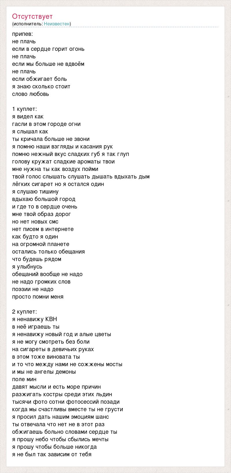 припев: не плачь если в сердце горит огонь не плачь если мы больше не вдвоём не плачь если обжигает боль я знаю сколько стоит слово любовь 1 куплет: я видел как гасли в этом городе огни я слышал как ты кричала больше не звони я помню наши взгляды и касания рук помню нежный вкус сладких губ я так глуп голову кружат сладкие ароматы твои мне нужна ты как воздух пойми твой голос слышать слушать дышать вдыхать дым лёгких сигарет но я остался один я слушаю тишину вдыхаю большой город и где то в сердце очень мне твой образ дорог но нет новых смс нет писем в интернете как будто я один на огромной планете остались только обещания что будешь рядом я улыбнусь обещаний вообще не надо не надо громких слов поэзии не надо просто помни меня 2 куплет: я ненавижу КВН в неё играешь ты я ненавижу новый год и алые цветы я не могу смотреть без боли на сигареты в девичьих руках в этом тоже виновата ты и то что между нами не сожжены мосты и мы не ангелы демоны поле мин давят мысли и есть море причин разжигать костры среди этих льдин тысячи фото сотни фотосессий позади когда мы счастливы вместе ты не грусти я просил дать нашим эмоциям шанс ты отвечала что нет не в этот раз обжигаешь больно словами сердце ты я прошу небо чтобы сбылись мечты я прошу чтобы больше никогда я не был так зависим от тебя