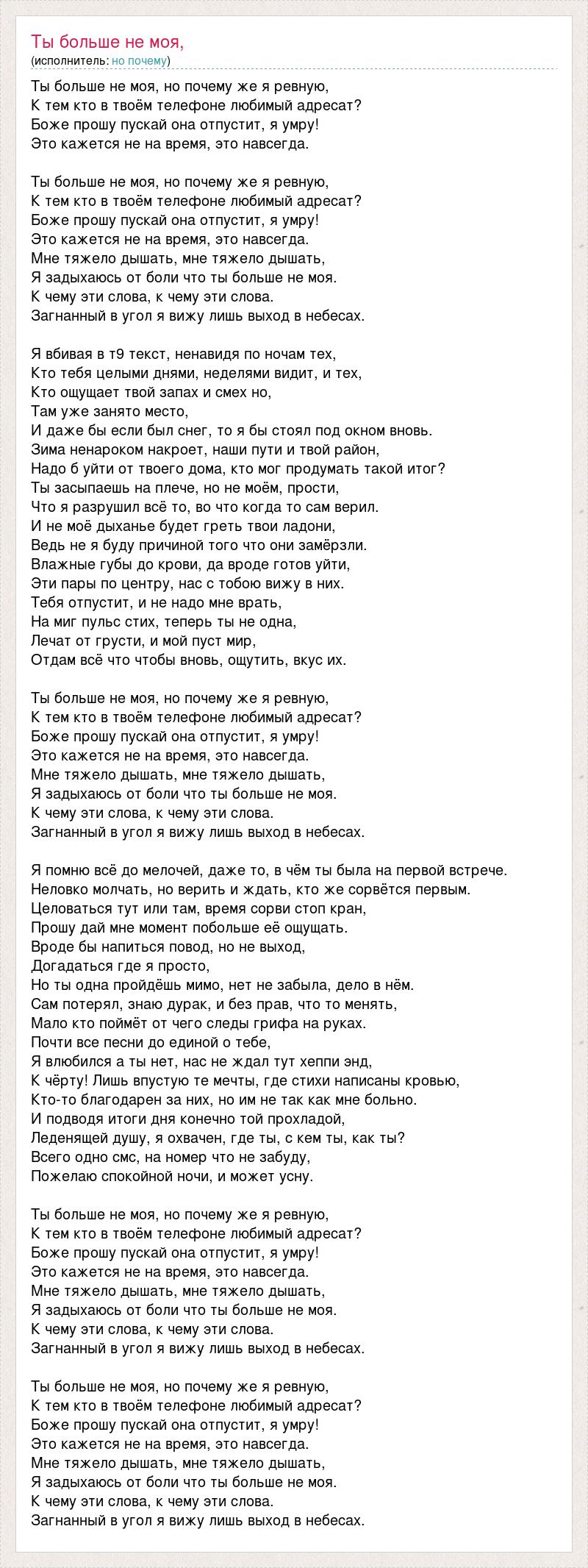 Ты больше не моя, но почему же я ревную, К тем кто в твоём телефоне любимый адресат? Боже прошу пускай она отпустит, я умру! Это кажется не на время, это навсегда. Ты больше не моя, но почему же я ревную, К тем кто в твоём телефоне любимый адресат? Боже прошу пускай она отпустит, я умру! Это кажется не на время, это навсегда. Мне тяжело дышать, мне тяжело дышать, Я задыхаюсь от боли что ты больше не моя. К чему эти слова, к чему эти слова. Загнанный в угол я вижу лишь выход в небесах. Я вбивая в т9 текст, ненавидя по ночам тех, Кто тебя целыми днями, неделями видит, и тех, Кто ощущает твой запах и смех но, Там уже занято место, И даже бы если был снег, то я бы стоял под окном вновь. Зима ненароком накроет, наши пути и твой район, Надо б уйти от твоего дома, кто мог продумать такой итог? Ты засыпаешь на плече, но не моём, прости, Что я разрушил всё то, во что когда то сам верил. И не моё дыханье будет греть твои ладони, Ведь не я буду причиной того что они замёрзли. Влажные губы до крови, да вроде готов уйти, Эти пары по центру, нас с тобою вижу в них. Тебя отпустит, и не надо мне врать, На миг пульс стих, теперь ты не одна, Лечат от грусти, и мой пуст мир, Отдам всё что чтобы вновь, ощутить, вкус их. Ты больше не моя, но почему же я ревную, К тем кто в твоём телефоне любимый адресат? Боже прошу пускай она отпустит, я умру! Это кажется не на время, это навсегда. Мне тяжело дышать, мне тяжело дышать, Я задыхаюсь от боли что ты больше не моя. К чему эти слова, к чему эти слова. Загнанный в угол я вижу лишь выход в небесах. Я помню всё до мелочей, даже то, в чём ты была на первой встрече. Неловко молчать, но верить и ждать, кто же сорвётся первым. Целоваться тут или там, время сорви стоп кран, Прошу дай мне момент побольше её ощущать. Вроде бы напиться повод, но не выход, Догадаться где я просто, Но ты одна пройдёшь мимо, нет не забыла, дело в нём. Сам потерял, знаю дурак, и без прав, что то менять, Мало кто поймёт от чего следы грифа на руках. Почти все песни до единой о тебе, Я влюбился а ты нет, нас не ждал тут хеппи энд, К чёрту! Лишь впустую те мечты, где стихи написаны кровью, Кто-то благодарен за них, но им не так как мне больно. И подводя итоги дня конечно той прохладой, Леденящей душу, я охвачен, где ты, с кем ты, как ты? Всего одно смс, на номер что не забуду, Пожелаю спокойной ночи, и может усну. Ты больше не моя, но почему же я ревную, К тем кто в твоём телефоне любимый адресат? Боже прошу пускай она отпустит, я умру! Это кажется не на время, это навсегда. Мне тяжело дышать, мне тяжело дышать, Я задыхаюсь от боли что ты больше не моя. К чему эти слова, к чему эти слова. Загнанный в угол я вижу лишь выход в небесах. Ты больше не моя, но почему же я ревную, К тем кто в твоём телефоне любимый адресат? Боже прошу пускай она отпустит, я умру! Это кажется не на время, это навсегда. Мне тяжело дышать, мне тяжело дышать, Я задыхаюсь от боли что ты больше не моя. К чему эти слова, к чему эти слова. Загнанный в угол я вижу лишь выход в небесах.