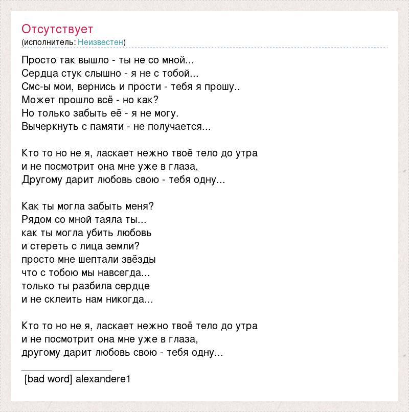 Просто так вышло - ты не со мной... Сердца стук слышно - я не с тобой... Смс-ы мои, вернись и прости - тебя я прошу.. Может прошло всё - но как? Но только забыть её - я не могу. Вычеркнуть с памяти - не получается... Кто то но не я, ласкает нежно твоё тело до утра и не посмотрит она мне уже в глаза, Другому дарит любовь свою - тебя одну... Как ты могла забыть меня? Рядом со мной таяла ты... как ты могла убить любовь и стереть с лица земли? просто мне шептали звёзды что с тобою мы навсегда... только ты разбила сердце и не склеить нам никогда... Кто то но не я, ласкает нежно твоё тело до утра и не посмотрит она мне уже в глаза, другому дарит любовь свою - тебя одну... ________________ [bad word] alexandere1