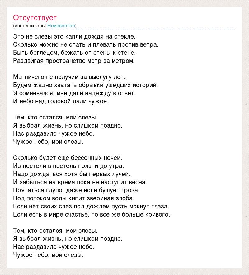 Это не слезы это капли дождя на стекле. Сколько можно не спать и плевать против ветра. Быть беглецом, бежать от стены к стене. Раздвигая пространство метр за метром. Мы ничего не получим за выслугу лет. Будем жадно хватать обрывки ушедших историй. Я сомневался, мне дали надежду в ответ. И небо над головой дали чужое. Тем, кто остался, мои слезы. Я выбрал жизнь, но слишком поздно. Нас раздавило чужое небо. Чужое небо, мои слезы. Сколько будет еще бессонных ночей. Из постели в постель ползти до утра. Надо дождаться хотя бы первых лучей. И забыться на время пока не наступит весна. Прятаться глупо, даже если бушует гроза. Под потоком воды кипит звериная злоба. Если нет своих слез под дождем пусть мокнут глаза. Если есть в мире счастье, то все же больше кривого. Тем, кто остался, мои слезы. Я выбрал жизнь, но слишком поздно. Нас раздавило чужое небо. Чужое небо, мои слезы.