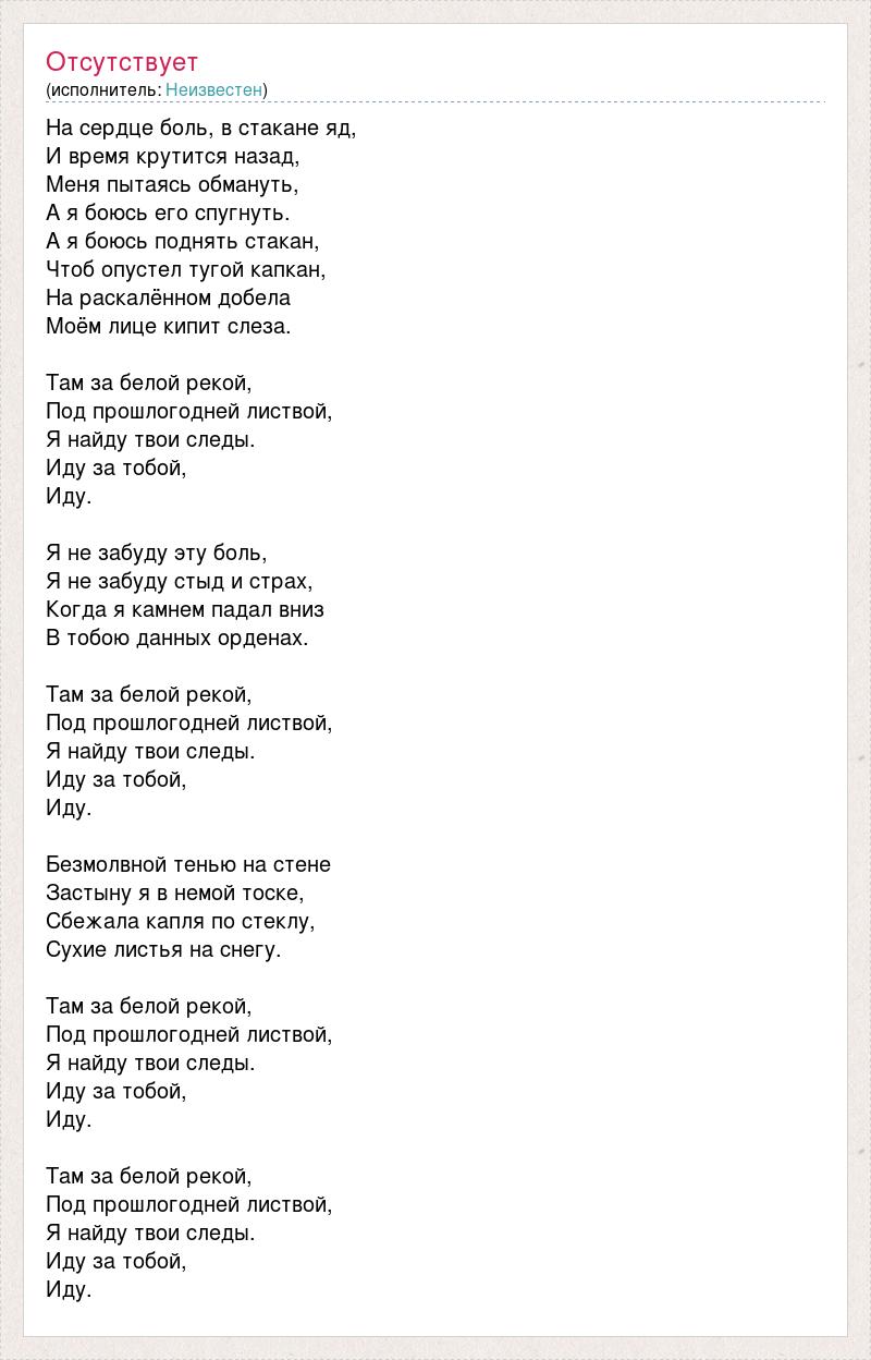 На сердце боль, в стакане яд, И время крутится назад, Меня пытаясь обмануть, А я боюсь его спугнуть. А я боюсь поднять стакан, Чтоб опустел тугой капкан, На раскалённом добела Моём лице кипит слеза. Там за белой рекой, Под прошлогодней листвой, Я найду твои следы. Иду за тобой, Иду. Я не забуду эту боль, Я не забуду стыд и страх, Когда я камнем падал вниз В тобою данных орденах. Там за белой рекой, Под прошлогодней листвой, Я найду твои следы. Иду за тобой, Иду. Безмолвной тенью на стене Застыну я в немой тоске, Сбежала капля по стеклу, Сухие листья на снегу. Там за белой рекой, Под прошлогодней листвой, Я найду твои следы. Иду за тобой, Иду. Там за белой рекой, Под прошлогодней листвой, Я найду твои следы. Иду за тобой, Иду.