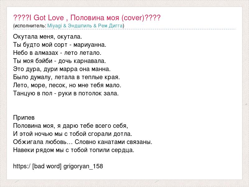 Окутала меня, окутала. Ты будто мой сорт - мариуанна. Небо в алмазах - лето летало. Ты моя бэйби - дочь карнавала. Это дура, дури марра она манна. Было думалу, летала в теплые края. Лето, море, песок, но мне тебя мало. Танцую в пол - руки в потолок зала. Припев Половина моя, я дарю тебе всего себя, И этой ночью мы с тобой сгорали дотла. Обжигала любовь… Словно канатами связаны. Навеки рядом мы с тобой топили сердца. https:/ [bad word] grigoryan_158