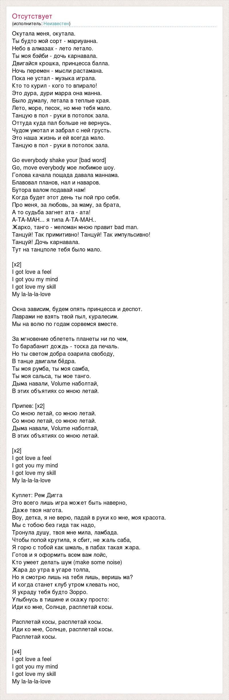 Окутала меня, окутала. Ты будто мой сорт - мариуанна. Небо в алмазах - лето летало. Ты моя бэйби - дочь карнавала. Двигайся крошка, принцесса балла. Ночь перемен - мысли растамана. Пока не устал - музыка играла. Кто то курил - кого то впирало! Это дура, дури марра она манна. Было думалу, летала в теплые края. Лето, море, песок, но мне тебя мало. Танцую в пол - руки в потолок зала. Оттуда куда пал больше не вернусь. Чудом умотал и забрал с ней грусть. Это наша жизнь и ей всегда мало. Танцую в пол - руки в потолок зала. Go everybody shake your [bad word] Go, move everybody мое любимое шоу. Голова качала пощада давала маннама. Блавовал планов, нал и наваров. Бутора валом подавай нам! Когда будет этот день ты пой про себя. Про меня, за любовь, за маму, за брата, А то судьба загнет ата - ата! А-ТА-МАН... я типа А-ТА-МАН.. Жарко, танго - меломан мною правит bad man. Танцуй! Так примитивно! Танцуй! Так импульсивно! Танцуй! Дочь карнавала. Тут на танцполе тебя было мало. [x2] I got love a feel I got you my mind I got love my skill My la-la-la-love Окна зависим, будем опять принцесса и деспот. Лаврами не взять твой пыл, куралесим. Мы на волю по годам сорвемся вместе. За мгновение облететь планеты ни по чем, То барабанит дождь - тоска да печаль. Но ты светом добра озарила свободу, В танце двигали бёдра. Ты моя румба, ты моя самба, Ты моя сальса, ты мое танго. Дыма навали, Volume наболтай, В этих объятиях со мною летай. Припев: [х2] Со мною летай, со мною летай. Со мною летай, со мною летай. Дыма навали, Volume наболтай, В этих объятиях со мною летай. [х2] I got love a feel I got you my mind I got love my skill My la-la-la-love Куплет: Рем Дигга Это всего лишь игра может быть наверно, Даже твоя нагота. Воу, детка, я не верю, падай в руки ко мне, моя красота. Мы с тобою без гида так надо, Тронула душу, твоя мне мила, ламбада. Чтобы попой крутила, я сбит, не жаль саба, Я горю с тобой как шмаль, в пабах такая жара. Готов и я оформить всем вам лойс, Кто умеет делать шум (make some noise) Жара до утра в угаре толпа, Но я смотрю лишь на тебя лишь, веришь ма? И когда станет клуб утром клевать нос, Я украду тебя будто Зорро. Улыбнусь в тишине и скажу просто: Иди ко мне, Солнце, расплетай косы. Расплетай косы, расплетай косы. Иди ко мне, Солнце, расплетай косы. Расплетай косы. [x4] I got love a feel I got you my mind I got love my skill My la-la-la-love