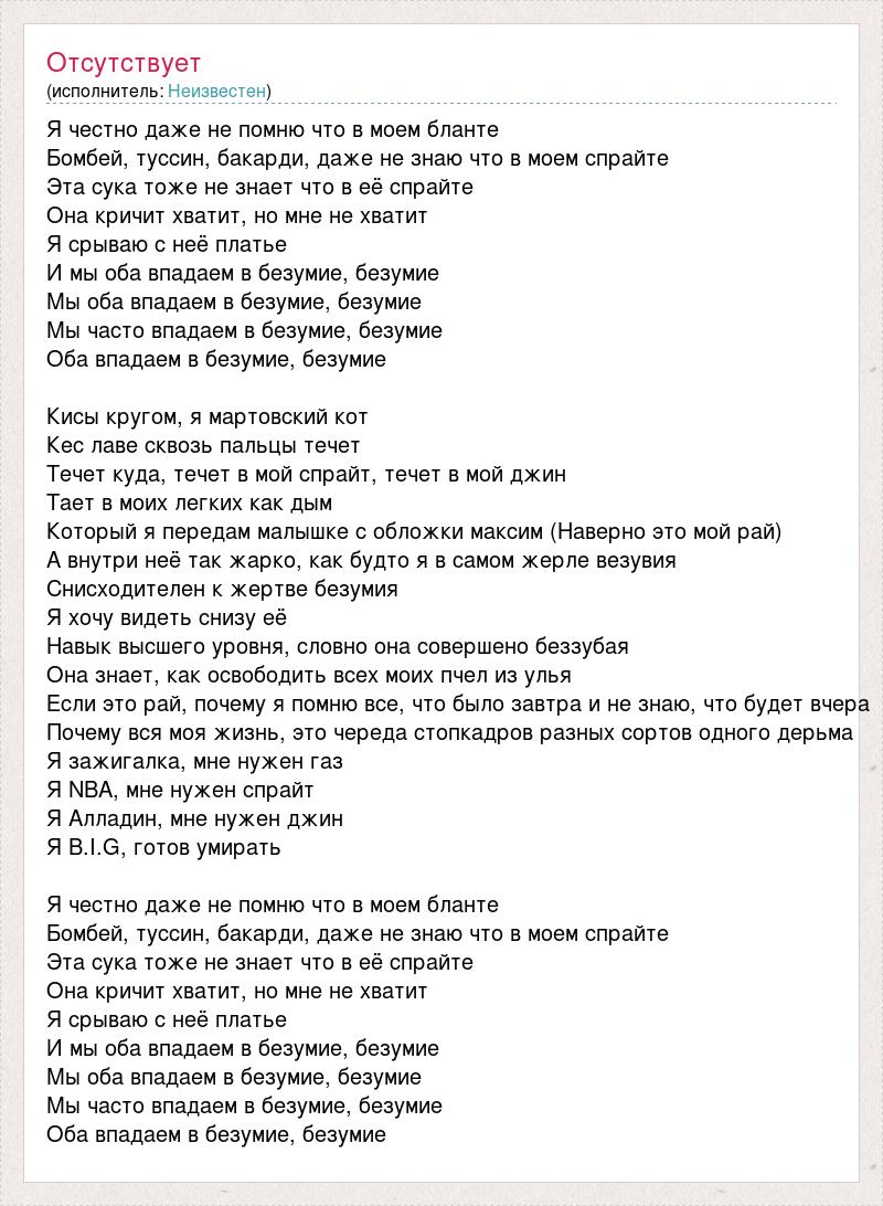 Я честно даже не помню что в моем бланте Бомбей, туссин, бакарди, даже не знаю что в моем спрайте Эта сука тоже не знает что в её спрайте Она кричит хватит, но мне не хватит Я срываю с неё платье И мы оба впадаем в безумие, безумие Мы оба впадаем в безумие, безумие Мы часто впадаем в безумие, безумие Оба впадаем в безумие, безумие Кисы кругом, я мартовский кот Кес лаве сквозь пальцы течет Течет куда, течет в мой спрайт, течет в мой джин Тает в моих легких как дым Который я передам малышке с обложки максим (Наверно это мой рай) А внутри неё так жарко, как будто я в самом жерле везувия Снисходителен к жертве безумия Я хочу видеть снизу её Навык высшего уровня, словно она совершено беззубая Она знает, как освободить всех моих пчел из улья Если это рай, почему я помню все, что было завтра и не знаю, что будет вчера Почему вся моя жизнь, это череда стопкадров разных сортов одного дерьма Я зажигалка, мне нужен газ Я NBA, мне нужен спрайт Я Алладин, мне нужен джин Я B.I.G, готов умирать Я честно даже не помню что в моем бланте Бомбей, туссин, бакарди, даже не знаю что в моем спрайте Эта сука тоже не знает что в её спрайте Она кричит хватит, но мне не хватит Я срываю с неё платье И мы оба впадаем в безумие, безумие Мы оба впадаем в безумие, безумие Мы часто впадаем в безумие, безумие Оба впадаем в безумие, безумие