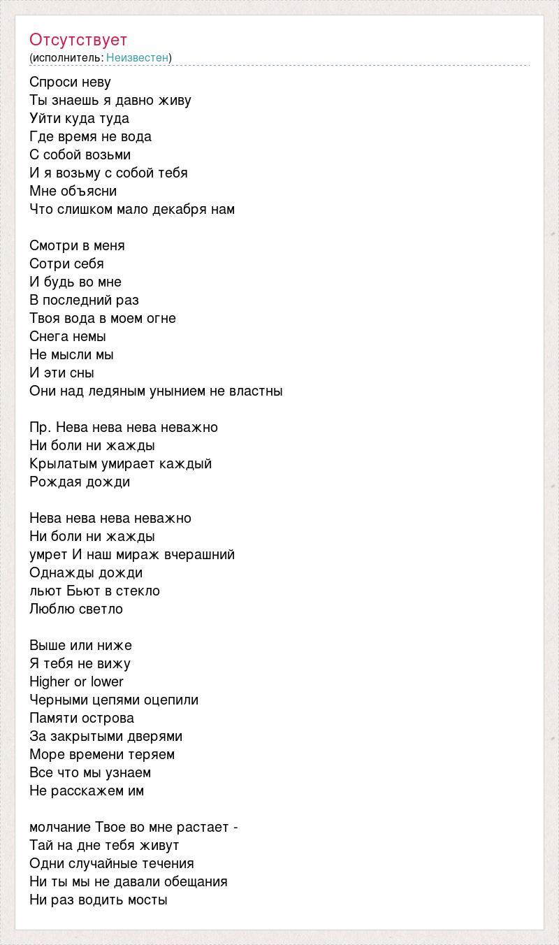 Спроси неву Ты знаешь я давно живу Уйти куда туда Где время не вода С собой возьми И я возьму с собой тебя Мне объясни Что слишком мало декабря нам Смотри в меня Сотри себя И будь во мне В последний раз Твоя вода в моем огне Снега немы Не мысли мы И эти сны Они над ледяным унынием не властны Пр. Нева нева нева неважно Ни боли ни жажды Крылатым умирает каждый Рождая дожди Нева нева нева неважно Ни боли ни жажды умрет И наш мираж вчерашний Однажды дожди льют Бьют в стекло Люблю светло Выше или ниже Я тебя не вижу Нigher or lower Черными цепями оцепили Памяти острова За закрытыми дверями Море времени теряем Все что мы узнаем Не расскажем им молчание Твое во мне растает - Тай на дне тебя живут Одни случайные течения Ни ты мы не давали обещания Ни раз водить мосты