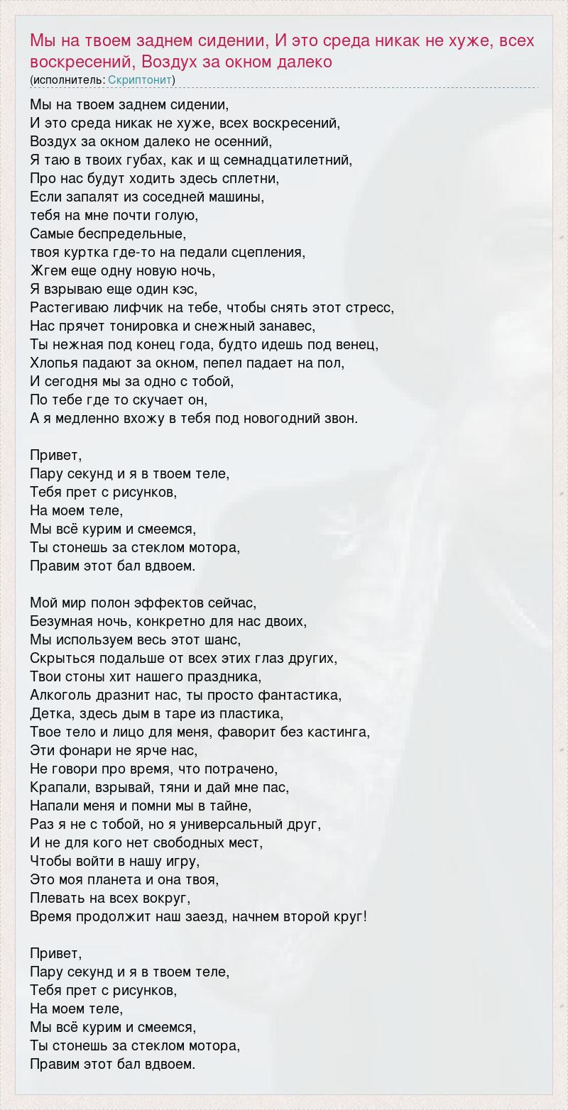 Мы на твоем заднем сидении, И это среда никак не хуже, всех воскресений, Воздух за окном далеко не осенний, Я таю в твоих губах, как и щ семнадцатилетний, Про нас будут ходить здесь сплетни, Если запалят из соседней машины, тебя на мне почти голую, Самые беспредельные, твоя куртка где-то на педали сцепления, Жгем еще одну новую ночь, Я взрываю еще один кэс, Растегиваю лифчик на тебе, чтобы снять этот стресс, Нас прячет тонировка и снежный занавес, Ты нежная под конец года, будто идешь под венец, Хлопья падают за окном, пепел падает на пол, И сегодня мы за одно с тобой, По тебе где то скучает он, А я медленно вхожу в тебя под новогодний звон. Привет, Пару секунд и я в твоем теле, Тебя прет с рисунков, На моем теле, Мы всё курим и смеемся, Ты стонешь за стеклом мотора, Правим этот бал вдвоем. Мой мир полон эффектов сейчас, Безумная ночь, конкретно для нас двоих, Мы используем весь этот шанс, Скрыться подальше от всех этих глаз других, Твои стоны хит нашего праздника, Алкоголь дразнит нас, ты просто фантастика, Детка, здесь дым в таре из пластика, Твое тело и лицо для меня, фаворит без кастинга, Эти фонари не ярче нас, Не говори про время, что потрачено, Крапали, взрывай, тяни и дай мне пас, Напали меня и помни мы в тайне, Раз я не с тобой, но я универсальный друг, И не для кого нет свободных мест, Чтобы войти в нашу игру, Это моя планета и она твоя, Плевать на всех вокруг, Время продолжит наш заезд, начнем второй круг! Привет, Пару секунд и я в твоем теле, Тебя прет с рисунков, На моем теле, Мы всё курим и смеемся, Ты стонешь за стеклом мотора, Правим этот бал вдвоем.