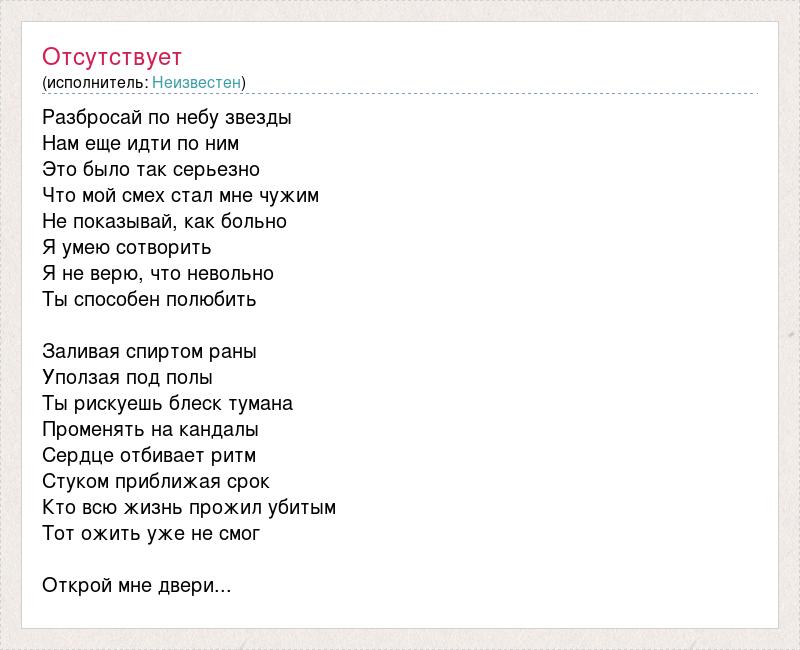 Разбросай по небу звезды Нам еще идти по ним Это было так серьезно Что мой смех стал мне чужим Не показывай, как больно Я умею сотворить Я не верю, что невольно Ты способен полюбить Заливая спиртом раны Уползая под полы Ты рискуешь блеск тумана Променять на кандалы Сердце отбивает ритм Стуком приближая срок Кто всю жизнь прожил убитым Тот ожить уже не смог Открой мне двери...