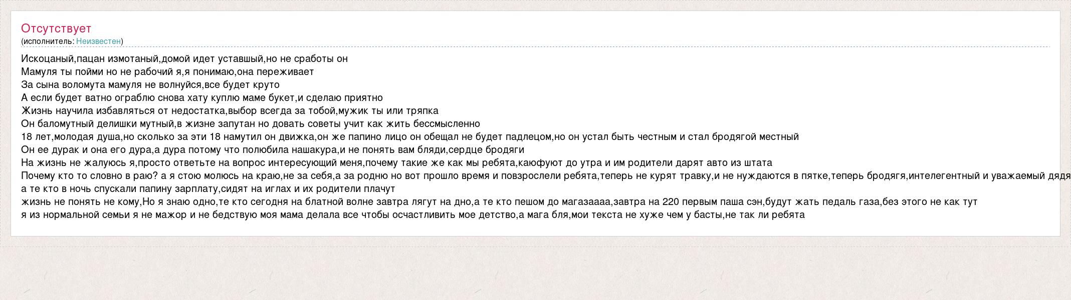 Искоцаный,пацан измотаный,домой идет уставшый,но не сработы он Мамуля ты пойми но не рабочий я,я понимаю,она переживает За сына воломута мамуля не волнуйся,все будет круто А если будет ватно ограблю снова хату куплю маме букет,и сделаю приятно Жизнь научила избавляться от недостатка,выбор всегда за тобой,мужик ты или тряпка Он баломутный делишки мутный,в жизне запутан но довать советы учит как жить бессмысленно 18 лет,молодая душа,но сколько за эти 18 намутил он движка,он же папино лицо он обещал не будет падлецом,но он устал быть честным и стал бродягой местный Он ее дурак и она его дура,а дура потому что полюбила нашакура,и не понять вам бляди,сердце бродяги На жизнь не жалуюсь я,просто ответьте на вопрос интересующий меня,почему такие же как мы ребята,каюфуют до утра и им родители дарят авто из штата Почему кто то словно в раю? а я стою молюсь на краю,не за себя,а за родню но вот прошло время и повзрослели ребята,теперь не курят травку,и не нуждаются в пятке,теперь бродягя,интелегентный и уважаемый дядя а те кто в ночь спускали папину зарплату,сидят на иглах и их родители плачут жизнь не понять не кому,Но я знаю одно,те кто сегодня на блатной волне завтра лягут на дно,а те кто пешом до магазаааа,завтра на 220 первым паша сэн,будут жать педаль газа,без этого не как тут я из нормальной семьи я не мажор и не бедствую моя мама делала все чтобы осчастливить мое детство,а мага бля,мои текста не хуже чем у басты,не так ли ребята