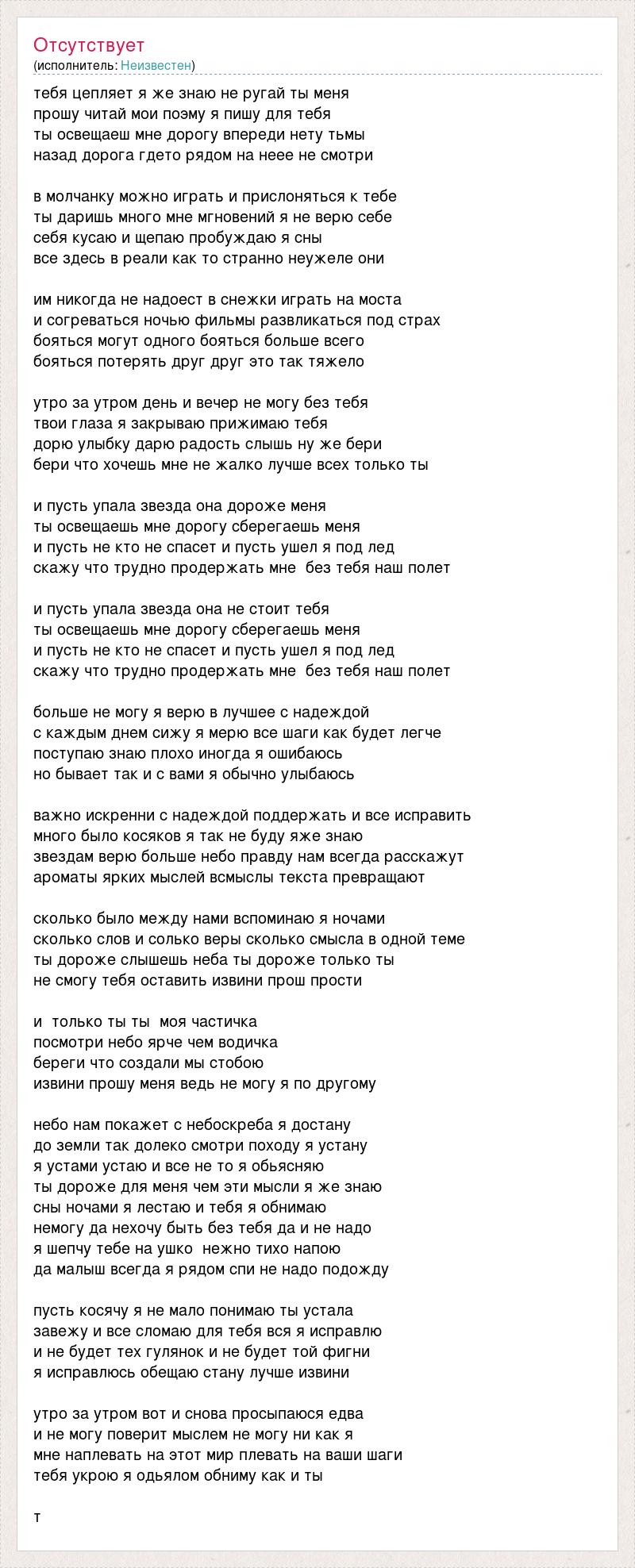тебя цепляет я же знаю не ругай ты меня прошу читай мои поэму я пишу для тебя ты освещаеш мне дорогу впереди нету тьмы назад дорога гдето рядом на неее не смотри в молчанку можно играть и прислоняться к тебе ты даришь много мне мгновений я не верю себе себя кусаю и щепаю пробуждаю я сны все здесь в реали как то странно неужеле они им никогда не надоест в снежки играть на моста и согреваться ночью фильмы развликаться под страх бояться могут одного бояться больше всего бояться потерять друг друг это так тяжело утро за утром день и вечер не могу без тебя твои глаза я закрываю прижимаю тебя дорю улыбку дарю радость слышь ну же бери бери что хочешь мне не жалко лучше всех только ты и пусть упала звезда она дороже меня ты освещаешь мне дорогу сберегаешь меня и пусть не кто не спасет и пусть ушел я под лед скажу что трудно продержать мне без тебя наш полет и пусть упала звезда она не стоит тебя ты освещаешь мне дорогу сберегаешь меня и пусть не кто не спасет и пусть ушел я под лед скажу что трудно продержать мне без тебя наш полет больше не могу я верю в лучшее с надеждой с каждым днем сижу я мерю все шаги как будет легче поступаю знаю плохо иногда я ошибаюсь но бывает так и с вами я обычно улыбаюсь важно искренни с надеждой поддержать и все исправить много было косяков я так не буду яже знаю звездам верю больше небо правду нам всегда расскажут ароматы ярких мыслей всмыслы текста превращают сколько было между нами вспоминаю я ночами сколько слов и солько веры сколько смысла в одной теме ты дороже слышешь неба ты дороже только ты не смогу тебя оставить извини прош прости и только ты ты моя частичка посмотри небо ярче чем водичка береги что создали мы стобою извини прошу меня ведь не могу я по другому небо нам покажет с небоскреба я достану до земли так долеко смотри походу я устану я устами устаю и все не то я обьясняю ты дороже для меня чем эти мысли я же знаю сны ночами я лестаю и тебя я обнимаю немогу да нехочу быть без тебя да и не надо я шепчу тебе на ушко нежно тихо напою да малыш всегда я рядом спи не надо подожду пусть косячу я не мало понимаю ты устала завежу и все сломаю для тебя вся я исправлю и не будет тех гулянок и не будет той фигни я исправлюсь обещаю стану лучше извини утро за утром вот и снова просыпаюся едва и не могу поверит мыслем не могу ни как я мне наплевать на этот мир плевать на ваши шаги тебя укрою я одьялом обниму как и ты т