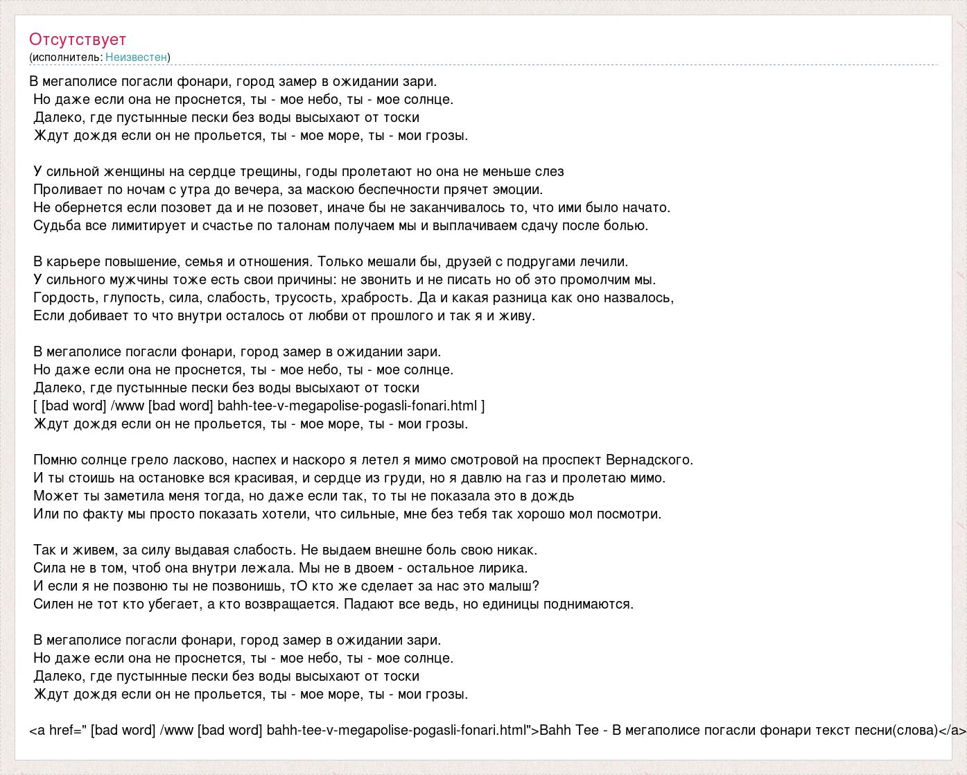 В мегаполисе погасли фонари, город замер в ожидании зари. Но даже если она не проснется, ты - мое небо, ты - мое солнце. Далеко, где пустынные пески без воды высыхают от тоски Ждут дождя если он не прольется, ты - мое море, ты - мои грозы. У сильной женщины на сердце трещины, годы пролетают но она не меньше слез Проливает по ночам с утра до вечера, за маскою беспечности прячет эмоции. Не обернется если позовет да и не позовет, иначе бы не заканчивалось то, что ими было начато. Судьба все лимитирует и счастье по талонам получаем мы и выплачиваем сдачу после болью. В карьере повышение, семья и отношения. Только мешали бы, друзей с подругами лечили. У сильного мужчины тоже есть свои причины: не звонить и не писать но об это промолчим мы. Гордость, глупость, сила, слабость, трусость, храбрость. Да и какая разница как оно назвалось, Если добивает то что внутри осталось от любви от прошлого и так я и живу. В мегаполисе погасли фонари, город замер в ожидании зари. Но даже если она не проснется, ты - мое небо, ты - мое солнце. Далеко, где пустынные пески без воды высыхают от тоски [ [bad word] /www [bad word] bahh-tee-v-megapolise-pogasli-fonari.html ] Ждут дождя если он не прольется, ты - мое море, ты - мои грозы. Помню солнце грело ласково, наспех и наскоро я летел я мимо смотровой на проспект Вернадского. И ты стоишь на остановке вся красивая, и сердце из груди, но я давлю на газ и пролетаю мимо. Может ты заметила меня тогда, но даже если так, то ты не показала это в дождь Или по факту мы просто показать хотели, что сильные, мне без тебя так хорошо мол посмотри. Так и живем, за силу выдавая слабость. Не выдаем внешне боль свою никак. Сила не в том, чтоб она внутри лежала. Мы не в двоем - остальное лирика. И если я не позвоню ты не позвонишь, тО кто же сделает за нас это малыш? Силен не тот кто убегает, а кто возвращается. Падают все ведь, но единицы поднимаются. В мегаполисе погасли фонари, город замер в ожидании зари. Но даже если она не проснется, ты - мое небо, ты - мое солнце. Далеко, где пустынные пески без воды высыхают от тоски Ждут дождя если он не прольется, ты - мое море, ты - мои грозы. <a href=" [bad word] /www [bad word] bahh-tee-v-megapolise-pogasli-fonari.html">Bahh Tee - В мегаполисе погасли фонари текст песни(слова)</a>