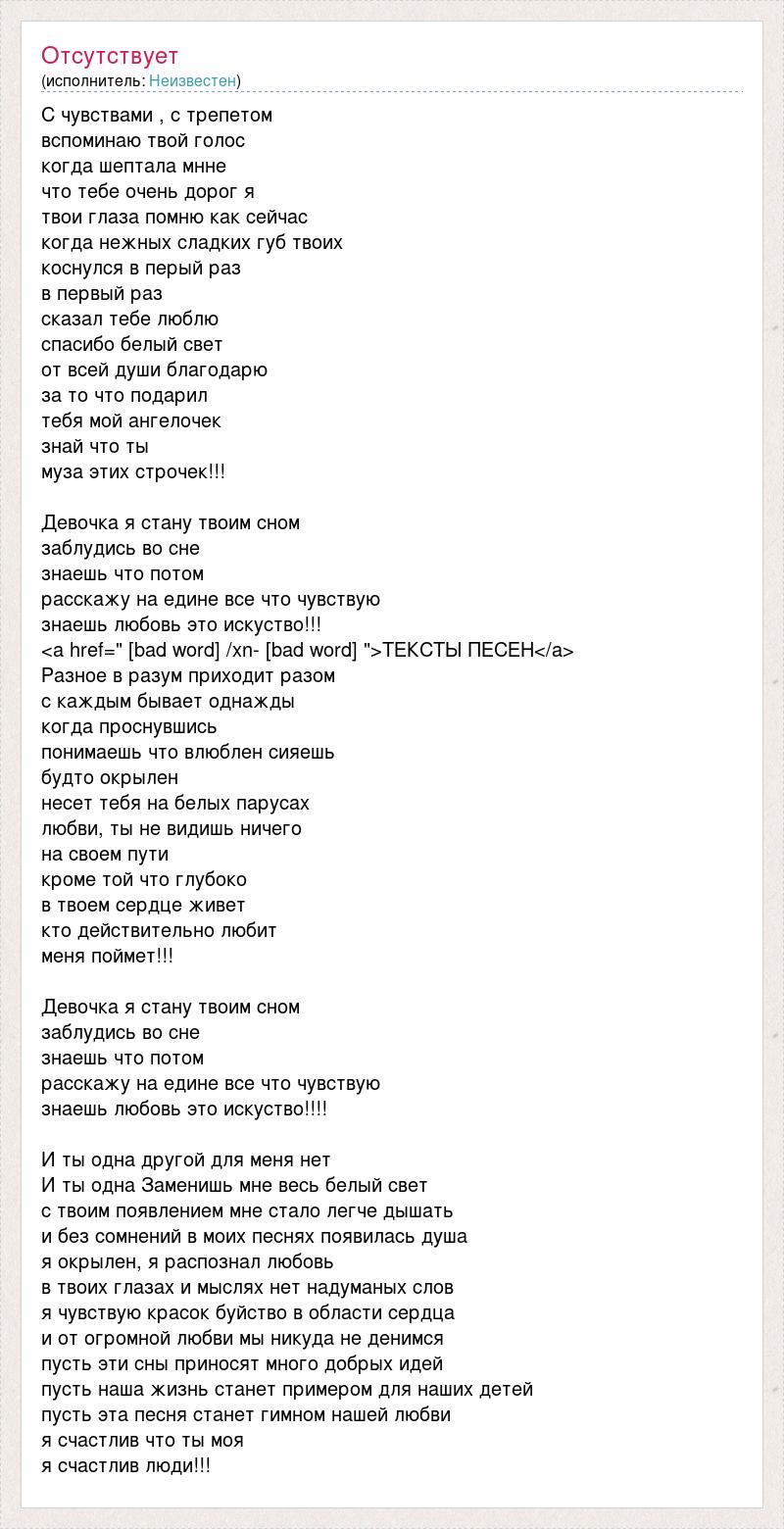 С чувствами , с трепетом вспоминаю твой голос когда шептала мнне что тебе очень дорог я твои глаза помню как сейчас когда нежных сладких губ твоих коснулся в перый раз в первый раз сказал тебе люблю спасибо белый свет от всей души благодарю за то что подарил тебя мой ангелочек знай что ты муза этих строчек!!! Девочка я стану твоим сном заблудись во сне знаешь что потом расскажу на едине все что чувствую знаешь любовь это искуство!!! <a href=" [bad word] /xn- [bad word] ">ТЕКСТЫ ПЕСЕН</a> Разное в разум приходит разом с каждым бывает однажды когда проснувшись понимаешь что влюблен сияешь будто окрылен несет тебя на белых парусах любви, ты не видишь ничего на своем пути кроме той что глубоко в твоем сердце живет кто действительно любит меня поймет!!! Девочка я стану твоим сном заблудись во сне знаешь что потом расскажу на едине все что чувствую знаешь любовь это искуство!!!! И ты одна другой для меня нет И ты одна Заменишь мне весь белый свет с твоим появлением мне стало легче дышать и без сомнений в моих песнях появилась душа я окрылен, я распознал любовь в твоих глазах и мыслях нет надуманых слов я чувствую красок буйство в области сердца и от огромной любви мы никуда не денимся пусть эти сны приносят много добрых идей пусть наша жизнь станет примером для наших детей пусть эта песня станет гимном нашей любви я счастлив что ты моя я счастлив люди!!!