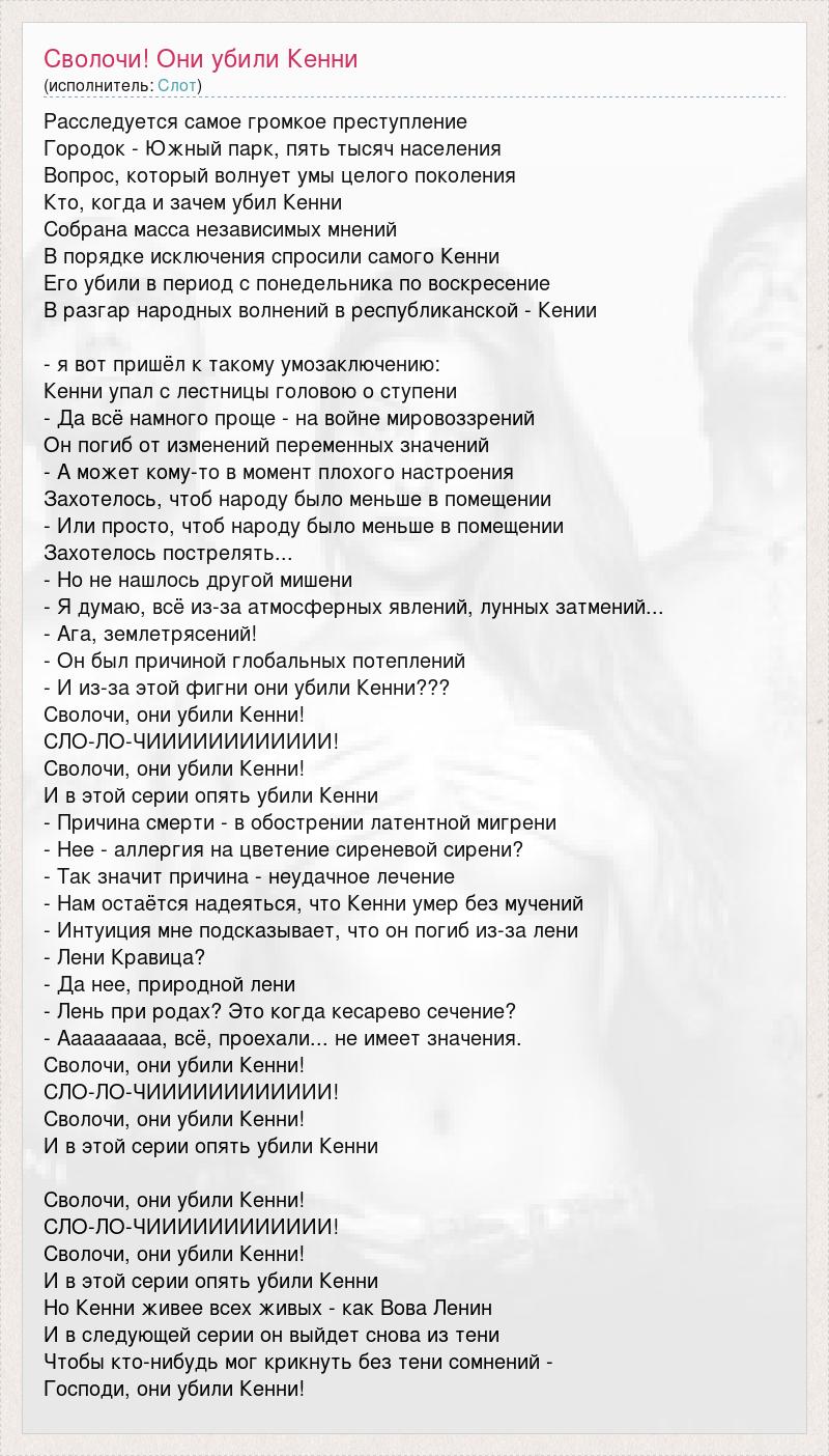 Расследуется самое громкое преступление Городок - Южный парк, пять тысяч населения Вопрос, который волнует умы целого поколения Кто, когда и зачем убил Кенни Собрана масса независимых мнений В порядке исключения спросили самого Кенни Его убили в период с понедельника по воскресение В разгар народных волнений в республиканской - Кении - я вот пришёл к такому умозаключению: Кенни упал с лестницы головою о ступени - Да всё намного проще - на войне мировоззрений Он погиб от изменений переменных значений - А может кому-то в момент плохого настроения Захотелось, чтоб народу было меньше в помещении - Или просто, чтоб народу было меньше в помещении Захотелось пострелять... - Но не нашлось другой мишени - Я думаю, всё из-за атмосферных явлений, лунных затмений... - Ага, землетрясений! - Он был причиной глобальных потеплений - И из-за этой фигни они убили Кенни??? Сволочи, они убили Кенни! СЛО-ЛО-ЧИИИИИИИИИИИИ! Сволочи, они убили Кенни! И в этой серии опять убили Кенни - Причина смерти - в обострении латентной мигрени - Нее - аллергия на цветение сиреневой сирени? - Так значит причина - неудачное лечение - Нам остаётся надеяться, что Кенни умер без мучений - Интуиция мне подсказывает, что он погиб из-за лени - Лени Кравица? - Да нее, природной лени - Лень при родах? Это когда кесарево сечение? - Ааааааааа, всё, проехали... не имеет значения. Сволочи, они убили Кенни! СЛО-ЛО-ЧИИИИИИИИИИИИ! Сволочи, они убили Кенни! И в этой серии опять убили Кенни Сволочи, они убили Кенни! СЛО-ЛО-ЧИИИИИИИИИИИИ! Сволочи, они убили Кенни! И в этой серии опять убили Кенни Но Кенни живее всех живых - как Вова Ленин И в следующей серии он выйдет снова из тени Чтобы кто-нибудь мог крикнуть без тени сомнений - Господи, они убили Кенни!
