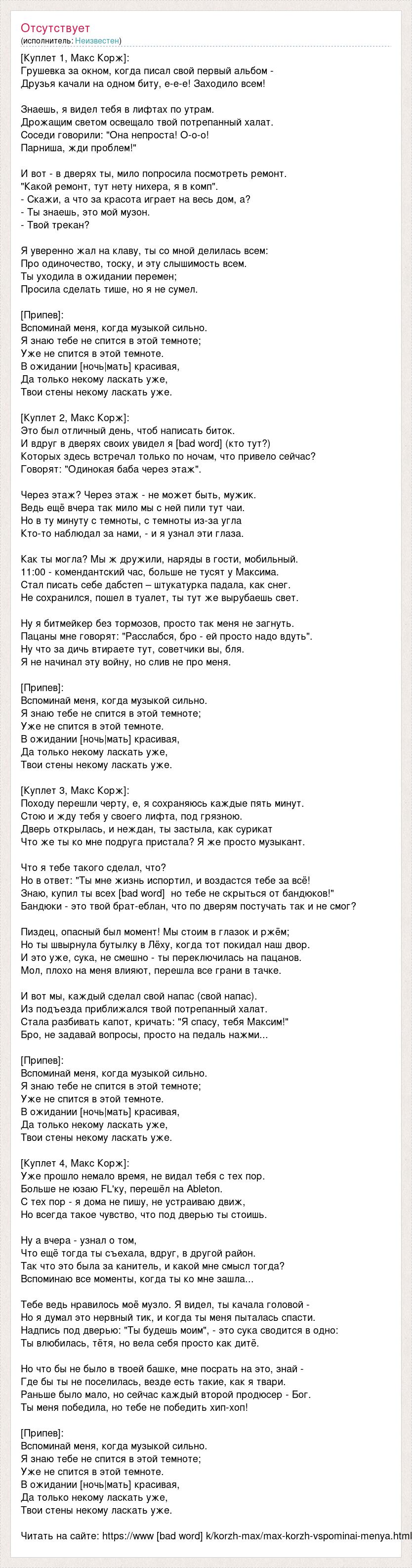 [Куплет 1, Макс Корж]: Грушевка за окном, когда писал свой первый альбом - Друзья качали на одном биту, е-е-е! Заходило всем! Знаешь, я видел тебя в лифтах по утрам. Дрожащим светом освещало твой потрепанный халат. Соседи говорили: "Она непроста! О-о-о! Парниша, жди проблем!" И вот - в дверях ты, мило попросила посмотреть ремонт. "Какой ремонт, тут нету нихера, я в комп". - Скажи, а что за красота играет на весь дом, а? - Ты знаешь, это мой музон. - Твой трекан? Я уверенно жал на клаву, ты со мной делилась всем: Про одиночество, тоску, и эту слышимость всем. Ты уходила в ожидании перемен; Просила сделать тише, но я не сумел. [Припев]: Вспоминай меня, когда музыкой сильно. Я знаю тебе не спится в этой темноте; Уже не спится в этой темноте. В ожидании [ночь|мать] красивая, Да только некому ласкать уже, Твои стены некому ласкать уже. [Куплет 2, Макс Корж]: Это был отличный день, чтоб написать биток. И вдруг в дверях своих увидел я [bad word] (кто тут?) Которых здесь встречал только по ночам, что привело сейчас? Говорят: "Одинокая баба через этаж". Через этаж? Через этаж - не может быть, мужик. Ведь ещё вчера так мило мы с ней пили тут чаи. Но в ту минуту с темноты, с темноты из-за угла Кто-то наблюдал за нами, - и я узнал эти глаза. Как ты могла? Мы ж дружили, наряды в гости, мобильный. 11:00 - комендантский час, больше не тусят у Максима. Стал писать себе дабстеп – штукатурка падала, как снег. Не сохранился, пошел в туалет, ты тут же вырубаешь свет. Ну я битмейкер без тормозов, просто так меня не загнуть. Пацаны мне говорят: "Расслабся, бро - ей просто надо вдуть". Ну что за дичь втираете тут, советчики вы, бля. Я не начинал эту войну, но слив не про меня. [Припев]: Вспоминай меня, когда музыкой сильно. Я знаю тебе не спится в этой темноте; Уже не спится в этой темноте. В ожидании [ночь|мать] красивая, Да только некому ласкать уже, Твои стены некому ласкать уже. [Куплет 3, Макс Корж]: Походу перешли черту, е, я сохраняюсь каждые пять минут. Стою и жду тебя у своего лифта, под грязною. Дверь открылась, и неждан, ты застыла, как сурикат Что же ты ко мне подруга пристала? Я же просто музыкант. Что я тебе такого сделал, что? Но в ответ: "Ты мне жизнь испортил, и воздастся тебе за всё! Знаю, купил ты всех [bad word] но тебе не скрыться от бандюков!" Бандюки - это твой брат-еблан, что по дверям постучать так и не смог? Пиздец, опасный был момент! Мы стоим в глазок и ржём; Но ты швырнула бутылку в Лёху, когда тот покидал наш двор. И это уже, сука, не смешно - ты переключилась на пацанов. Мол, плохо на меня влияют, перешла все грани в тачке. И вот мы, каждый сделал свой напас (свой напас). Из подъезда приближался твой потрепанный халат. Стала разбивать капот, кричать: "Я спасу, тебя Максим!" Бро, не задавай вопросы, просто на педаль нажми... [Припев]: Вспоминай меня, когда музыкой сильно. Я знаю тебе не спится в этой темноте; Уже не спится в этой темноте. В ожидании [ночь|мать] красивая, Да только некому ласкать уже, Твои стены некому ласкать уже. [Куплет 4, Макс Корж]: Уже прошло немало время, не видал тебя с тех пор. Больше не юзаю FL'ку, перешёл на Ableton. С тех пор - я дома не пишу, не устраиваю движ, Но всегда такое чувство, что под дверью ты стоишь. Ну а вчера - узнал о том, Что ещё тогда ты съехала, вдруг, в другой район. Так что это была за канитель, и какой мне смысл тогда? Вспоминаю все моменты, когда ты ко мне зашла... Тебе ведь нравилось моё музло. Я видел, ты кача