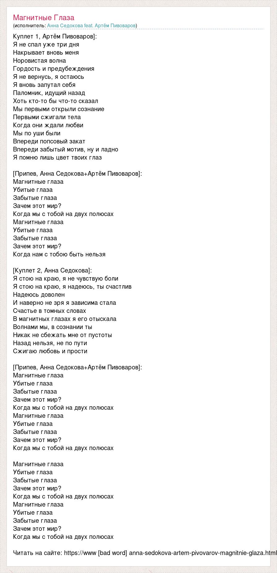 Куплет 1, Артём Пивоваров]: Я не спал уже три дня Накрывает вновь меня Норовистая волна Гордость и предубеждения Я не вернусь, я остаюсь Я вновь запутал себя Паломник, идущий назад Хоть кто-то бы что-то сказал Мы первыми открыли сознание Первыми сжигали тела Когда они ждали любви Мы по уши были Впереди попсовый закат Впереди забытый мотив, ну и ладно Я помню лишь цвет твоих глаз [Припев, Анна Седокова+Артём Пивоваров]: Магнитные глаза Убитые глаза Забытые глаза Зачем этот мир? Когда мы с тобой на двух полюсах Магнитные глаза Убитые глаза Забытые глаза Зачем этот мир? Когда нам с тобою быть нельзя [Куплет 2, Анна Седокова]: Я стою на краю, я не чувствую боли Я стою на краю, я надеюсь, ты счастлив Надеюсь доволен И наверно не зря я зависима стала Счастье в томных словах В магнитных глазах я его отыскала Волнами мы, в сознании ты Никак не сбежать мне от пустоты Назад нельзя, не по пути Сжигаю любовь и прости [Припев, Анна Седокова+Артём Пивоваров]: Магнитные глаза Убитые глаза Забытые глаза Зачем этот мир? Когда мы с тобой на двух полюсах Магнитные глаза Убитые глаза Забытые глаза Зачем этот мир? Когда мы с тобой на двух полюсах Магнитные глаза Убитые глаза Забытые глаза Зачем этот мир? Когда мы с тобой на двух полюсах Магнитные глаза Убитые глаза Забытые глаза Зачем этот мир? Когда мы с тобой на двух полюсах Читать на сайте: https://www [bad word] anna-sedokova-artem-pivovarov-magnitnie-glaza.html